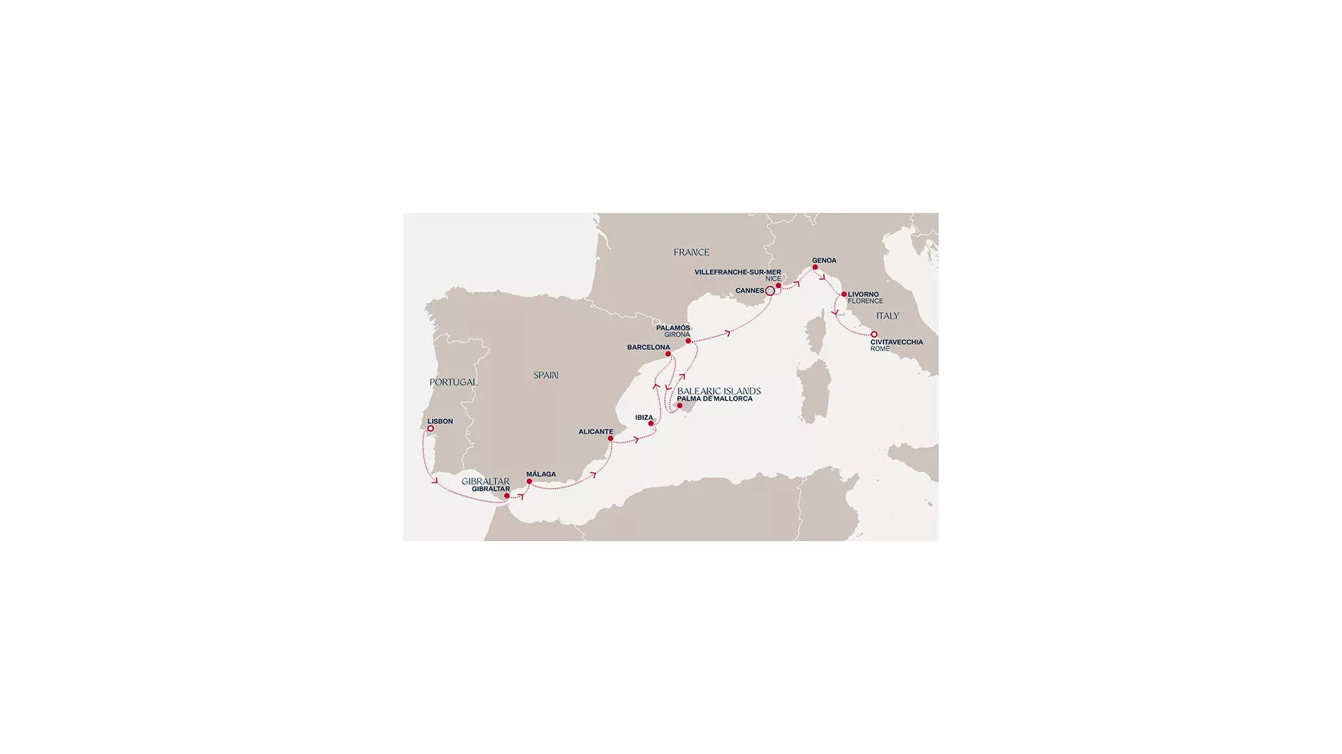 Begin with time to settle into Lisbon’s rhythm before sailing south to Gibraltar and Málaga, where Andalusian culture and coastal life unfold. After a day at sea, Alicante and Ibiza bring a lighter Mediterranean pace, followed by Barcelona’s creative energy. Along Spain’s eastern coast, Palma and Palamós offer a more relaxed perspective before arriving in Cannes for a dazzling New Year celebration. The journey continues along the Riviera to Genoa and Florence, concluding in Rome with its enduring sense of history.