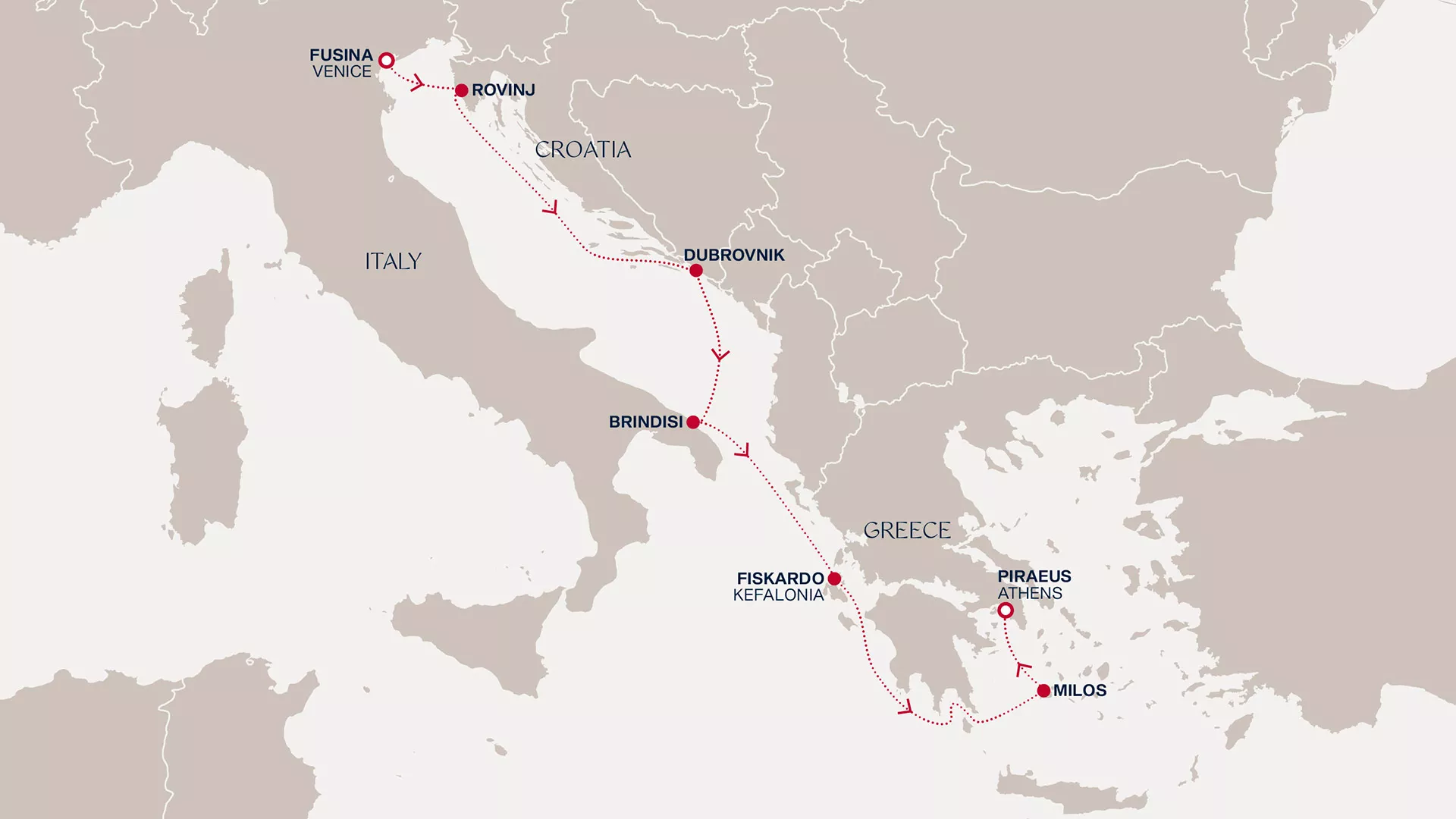Venice warmly invites us to explore its far-reaching heritage as we sail onwards to Rovinj’s charming Croatian sparkle. In Dubrovnik, medieval walls give way to azure waters that stir your soul, and Brindisi opens your heart to Puglia’s historic natural beauty. Explore the quaint harbour of Fiskardo, Kefalonia’s pine-fringed gem and absorb Milos' iconic shores and caldera views before drawing into the city buzz of Athens.