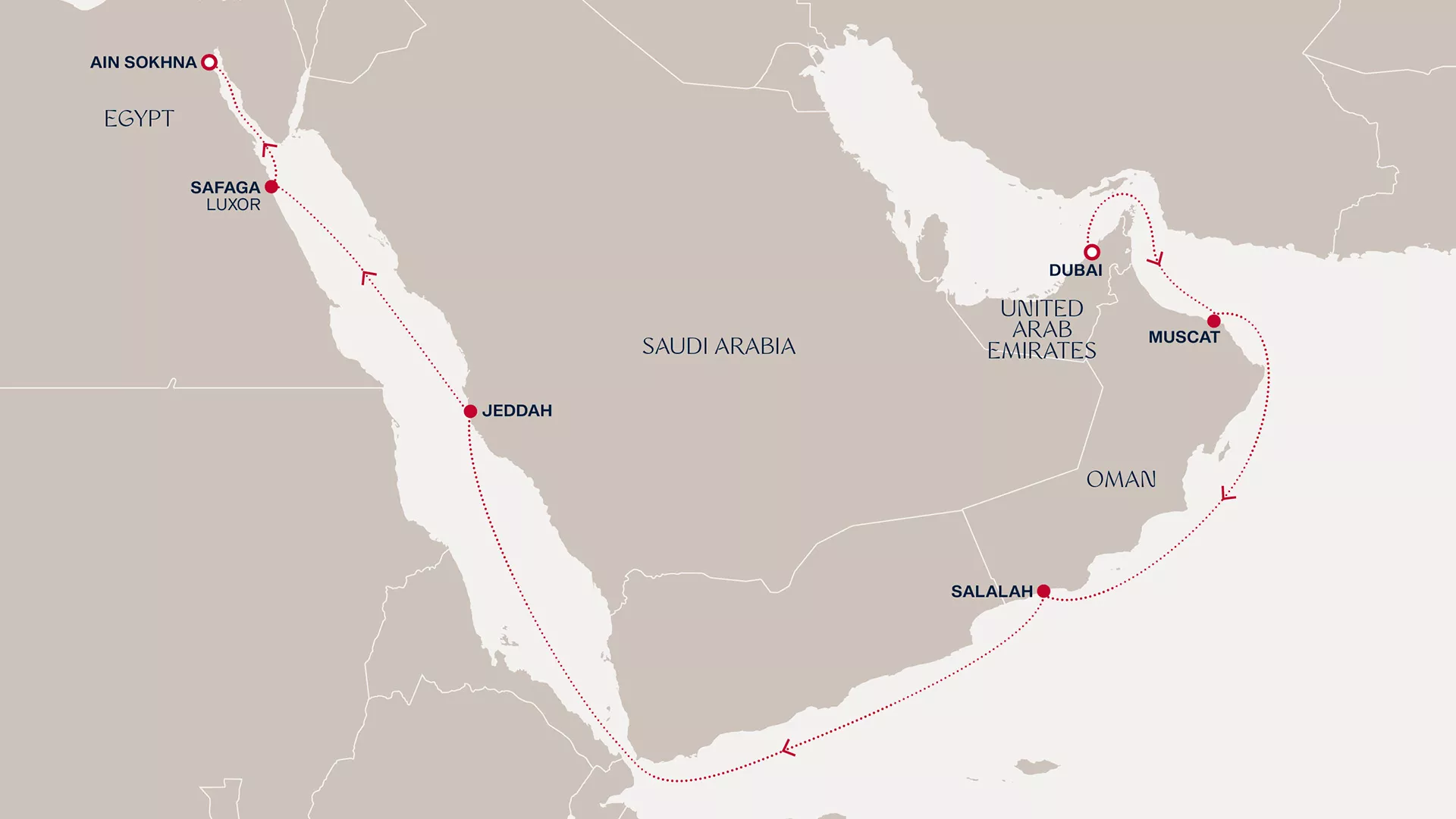 einer Übernachtung im glamourösen Dubai setzen wir unsere Reise durch ruhige Gewässer fort und erreichen Maskat, das uns mit