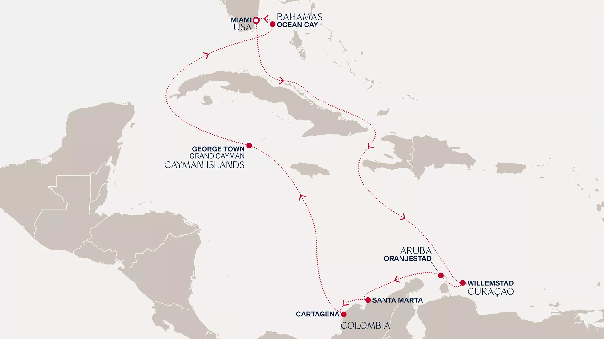 Embark on a sun-soaked Caribbean exploration from Miami, sailing to Willemstad, where vibrant Dutch charm meets Creole cuisine and coral wonders. In Oranjestad, explore colourful streets and pristine beaches, then venture to Santa Marta’s lush mountains and golden sands. Experience the enchantment of Cartagena’s walled city before Grand Cayman invites you to explore spectacular reefs and swim with stingrays. Relax in Ocean Cay’s tranquil island retreat, then glide back to Miami’s lively shores.