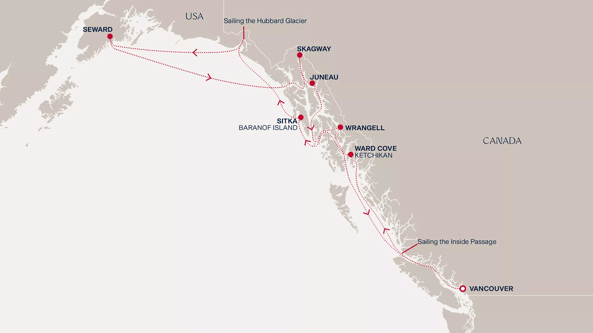 Start your captivating journey from lively Vancouver, where mountains and oceans frame a bustling metropolis. Delve into the Alaskan wilderness at Ward Cove, Sitka, and Hubbard, each offering majestic landscapes and wildlife wonders. Experience the heart-pounding beauty of Seward and Skagway's historical charm. In Juneau, encounter glaciers and marine life, before exploring Wrangell’s untouched natural beauty. Return to the cosmopolitan allure of Vancouver, where urban sophistication meets nature's grandeur.