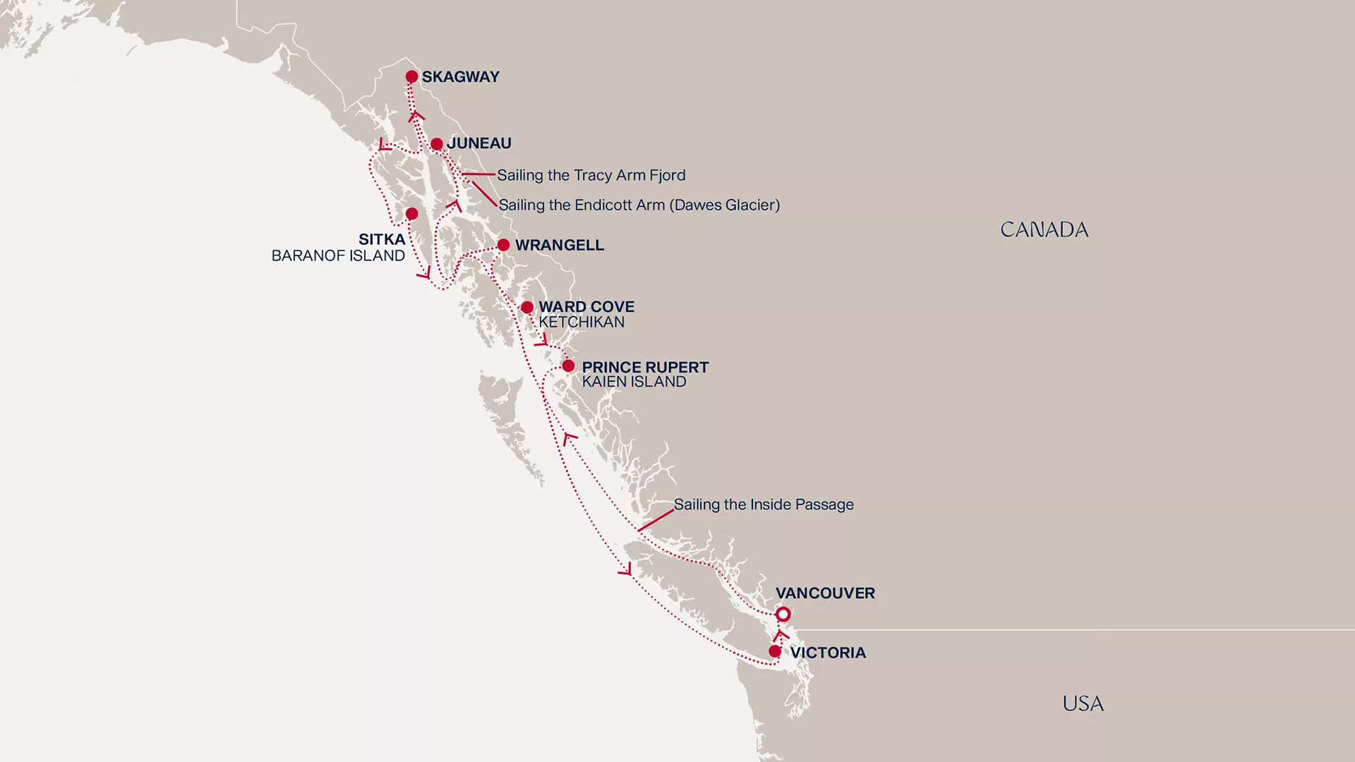 Drift away from mountain-fringed Vancouver and sail the spectacular Inside Passage into the scenic heart of Alaska. Explore the wildlife of Wrangell and Juneau’s eclectic charm, then absorb the unparalleled beauty of the Dawes Glacier and the Tracy Arm Fjord. Skagway’s rich history unfolds before you, followed by the island charm and outdoor adventures of Ketchikan and the rugged scenery of Prince Rupert. Enjoy a peaceful day at sea before we glide into the elegance of Victoria and return to Vancouver’s untamed spirit.
