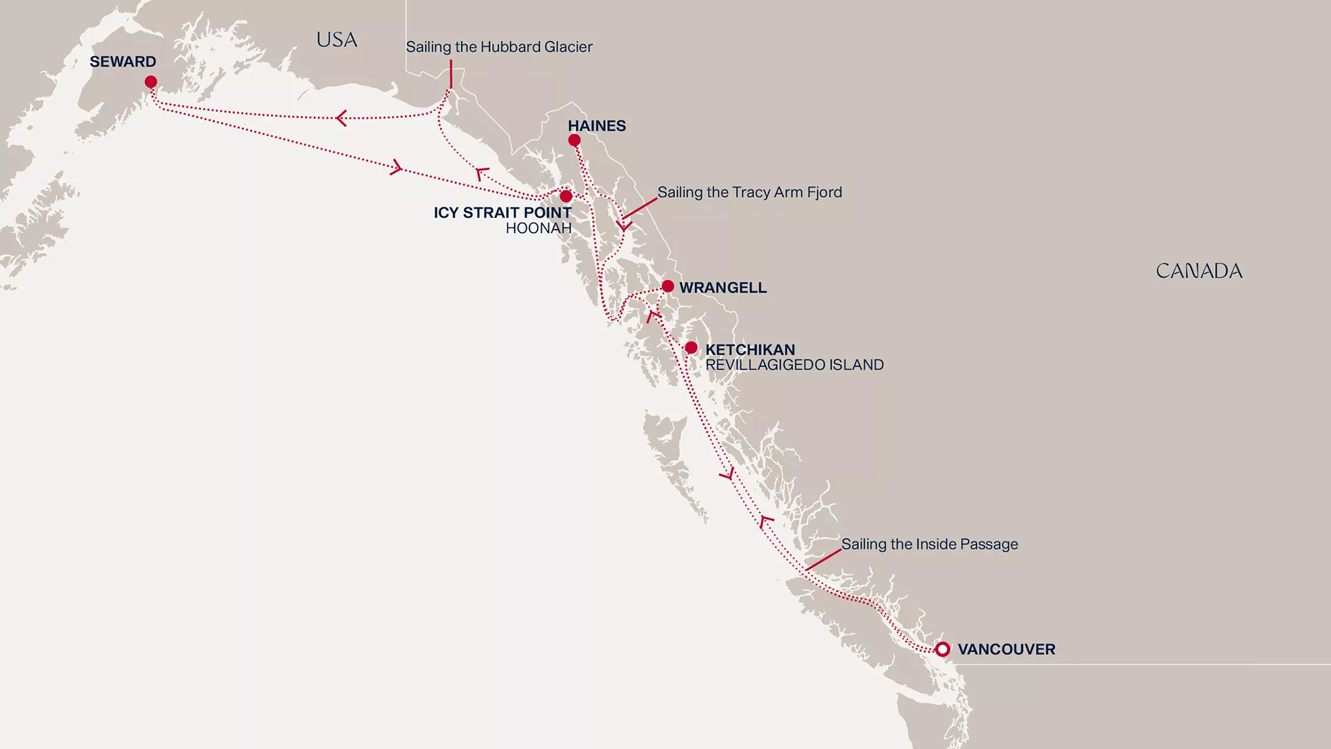 From lively Vancouver, sail the fabled Inside Passage, surrounded by misty forests and ocean calm. Discover the totem poles of Ketchikan and Hoonah’s rugged paradise. Witness the thunder of the Hubbard Glacier’s icy echoes against majestic peaks, then pause for adventure in Seward. Relish time to reflect and unwind onboard before we reach the scenic trails of Haines. Admire the steep cliffs and glaciers of the Tracy Arm Fjord, embrace Wrangell’s wild charms, then loop back to the buzz of Vancouver.
