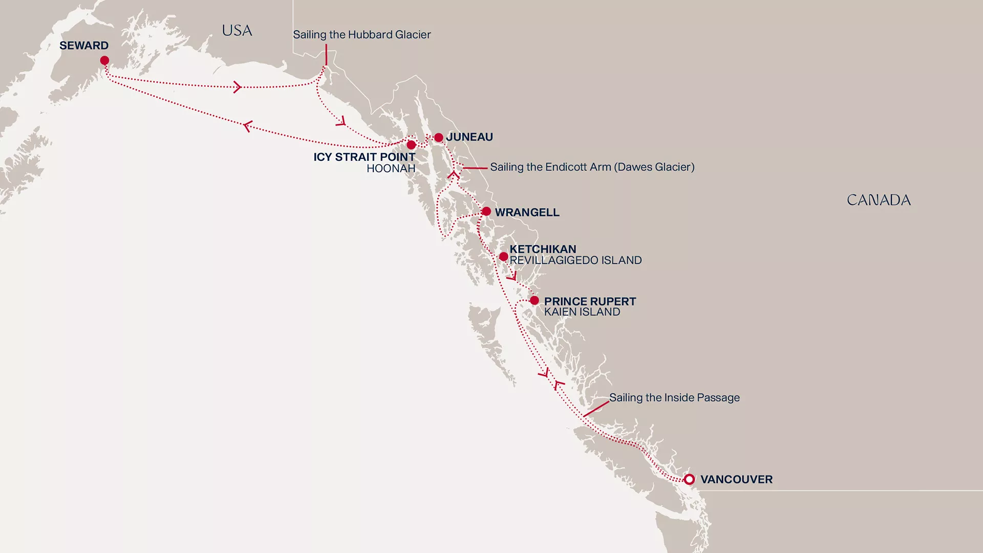 Set out from Vancouver, tracing the tranquil Inside Passage to Wrangell’s untamed beauty and Juneau’s mountain-framed wonders. Rest and revitalise at sea as we glide to Seward’s epic cliffs and icefields. Bask in the icy majesty of Hubbard Glacier, admire Hoonah’s wildlife paradise and sail through the Endicott Arm’s sapphire waters to Dawes Glacier. Ketchikan and Prince Rupert offer unforgettable outdoor adventures until the soul of Vancouver stirs us to return once more.