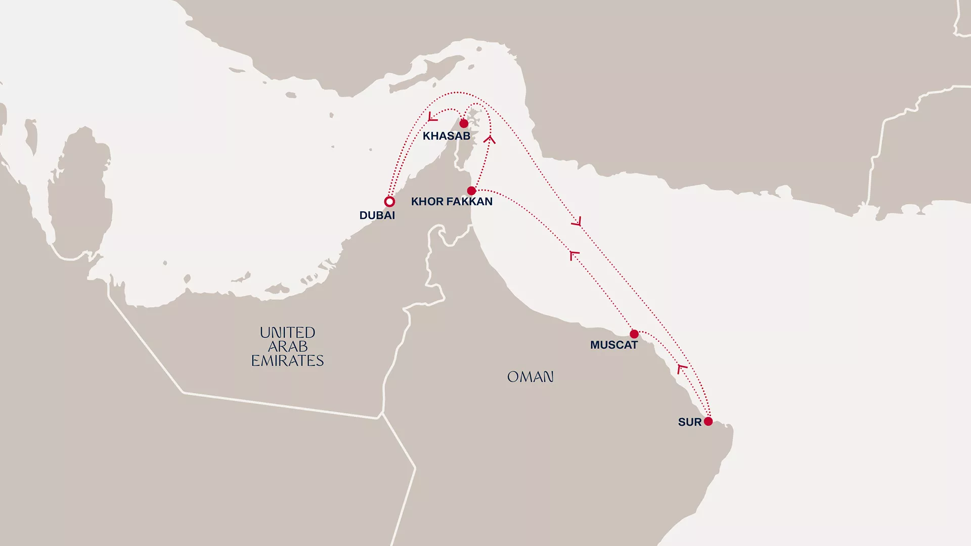 Set sail on an extraordinary journey from Dubai’s spectacular skyline, spending a serene day at sea, before we pause to uncover Sur’s rich maritime heritage, desert magic and turquoise lagoons. In Muscat, peer into lively souks filled with gold and silver, then drift to Khor Fakkan’s rugged coastline and Khasab’s dramatic inlets, perfect for dolphin watching. Return to Dubai, where a mix of modern luxury and cultural charm creates a wonderful finale.