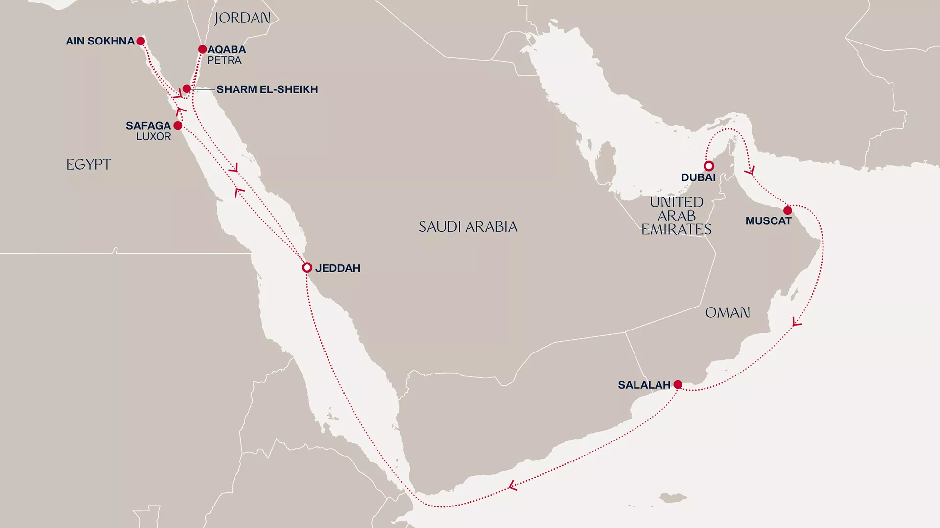 beauty. Begin with an overnight in innovative Dubai, then sail to Muscat’s