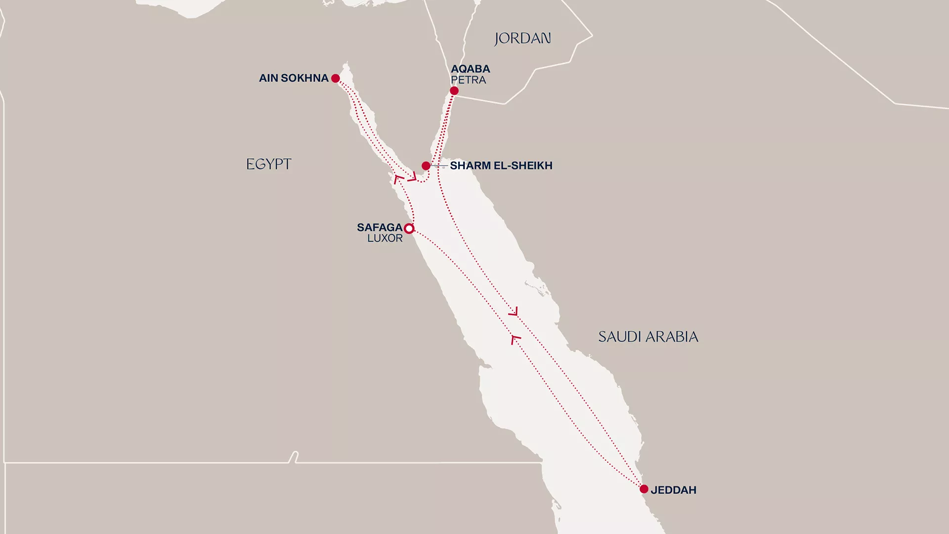 We launch this riveting journey from Safaga's gateway to Luxor and into an exploration of Egypt’s treasures, traversing underwater reefs, Red Sea monasteries and the almighty Pyramids. Continue to uncover impressive beauty and culture at Sharm El-Sheikh’s sapphire lagoons and charming villages. At Aqaba, visit the red rocks of Petra and stroll through spice-scented souks. After an overnight stop to admire bustling Jeddah’s great monuments, we return to Luxor’s ancient wonders.