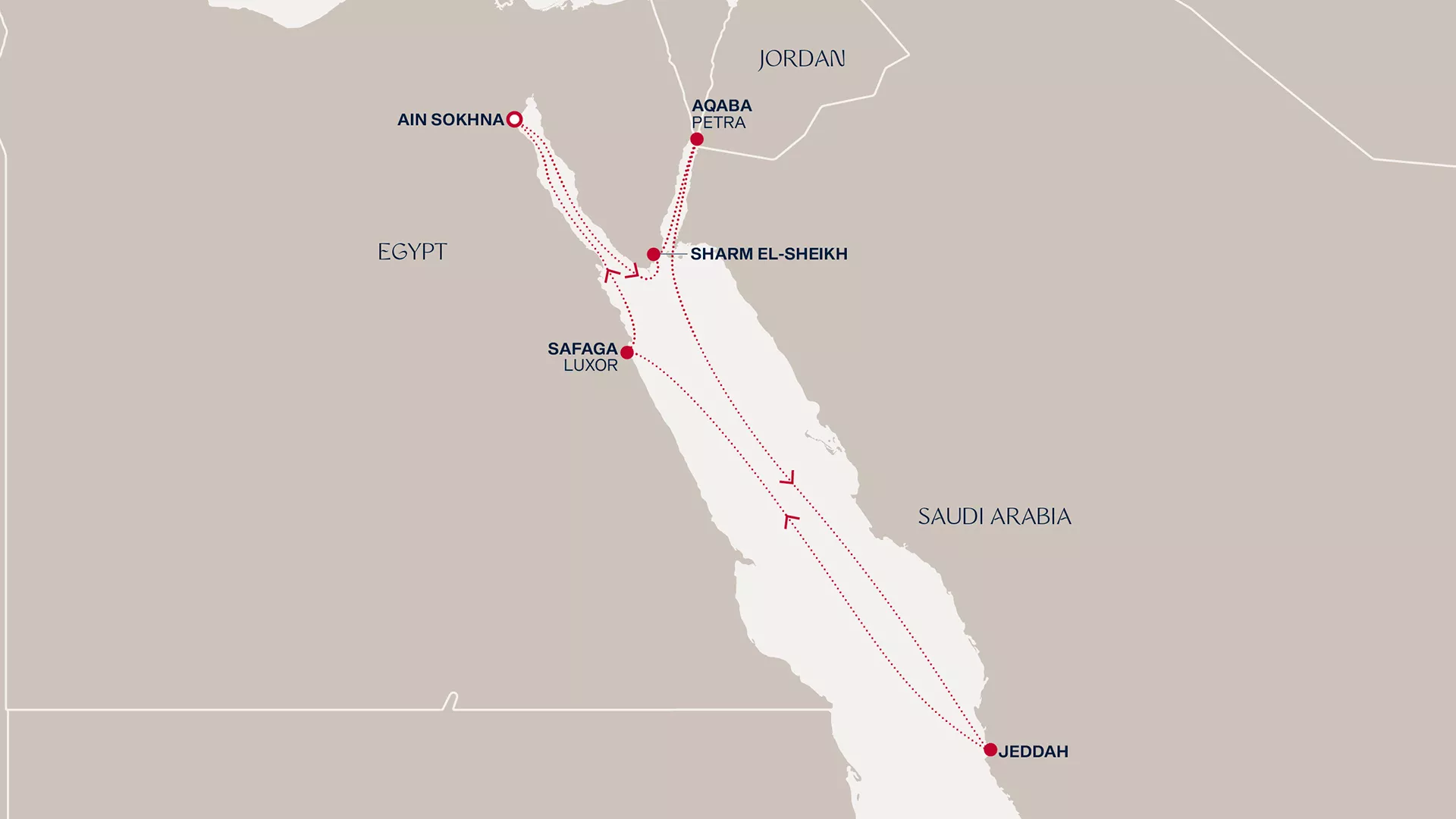 As ancient wonders beckon, we set sail from Ain Sokhna’s natural majesty to immerse ourselves in the multi-coloured reefs of Sharm El-Sheikh and reach Petra’s spectacular russet rock from the elegant charms of Aqaba. Luxuriate in the refined comforts of EXPLORA II, stopping overnight in the historic energy of Jeddah. Then spend an unforgettable night in Safaga, close to great mysteries and mighty temples, before our journey comes full circle on the sunny beaches of Ain Sokhna.