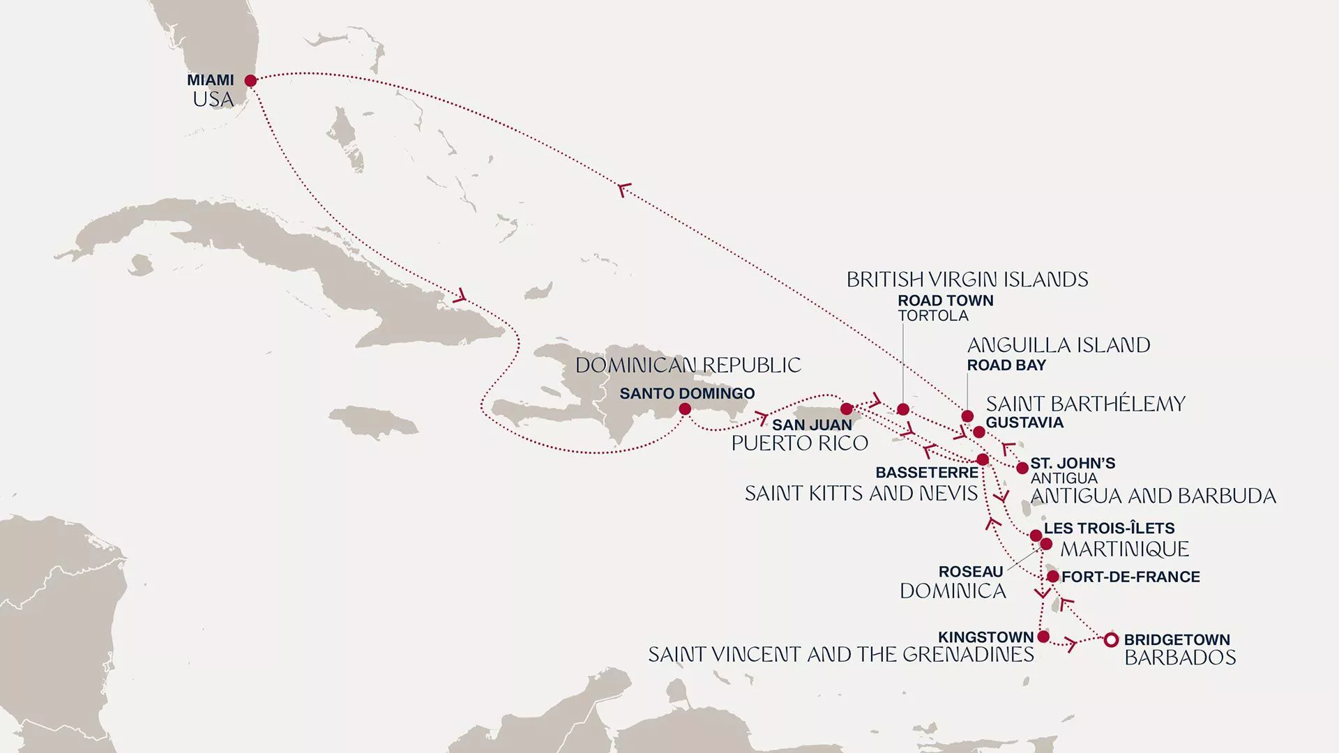 In Fort-de-France we find boulangeries selling croissants before rising with dawn to peer into the mile-wide crater near Basseterre. Our journey lets us compare the cerulean lagoons of Tortola with the pristine jade forests and beaches of Antigua. A late departure from Saint Barthélemy offers a truly mesmerising scene as we reach Miami blessed with uninterrupted bliss as the skyline appears on a deliciously humid horizon. Brilliant biodiversity, conquistadors and haute cuisine bridge Miami to Bridgetown as we make maiden calls in Santo Domingo and Les Trois-Îlets. But it’s the in-between outposts that stay with us – afternoons wandering jungle paths thick with secrets in Basseterre and Roseau, the wild kind of grace we find in Kingston and the limey vibes in Bridgetown.