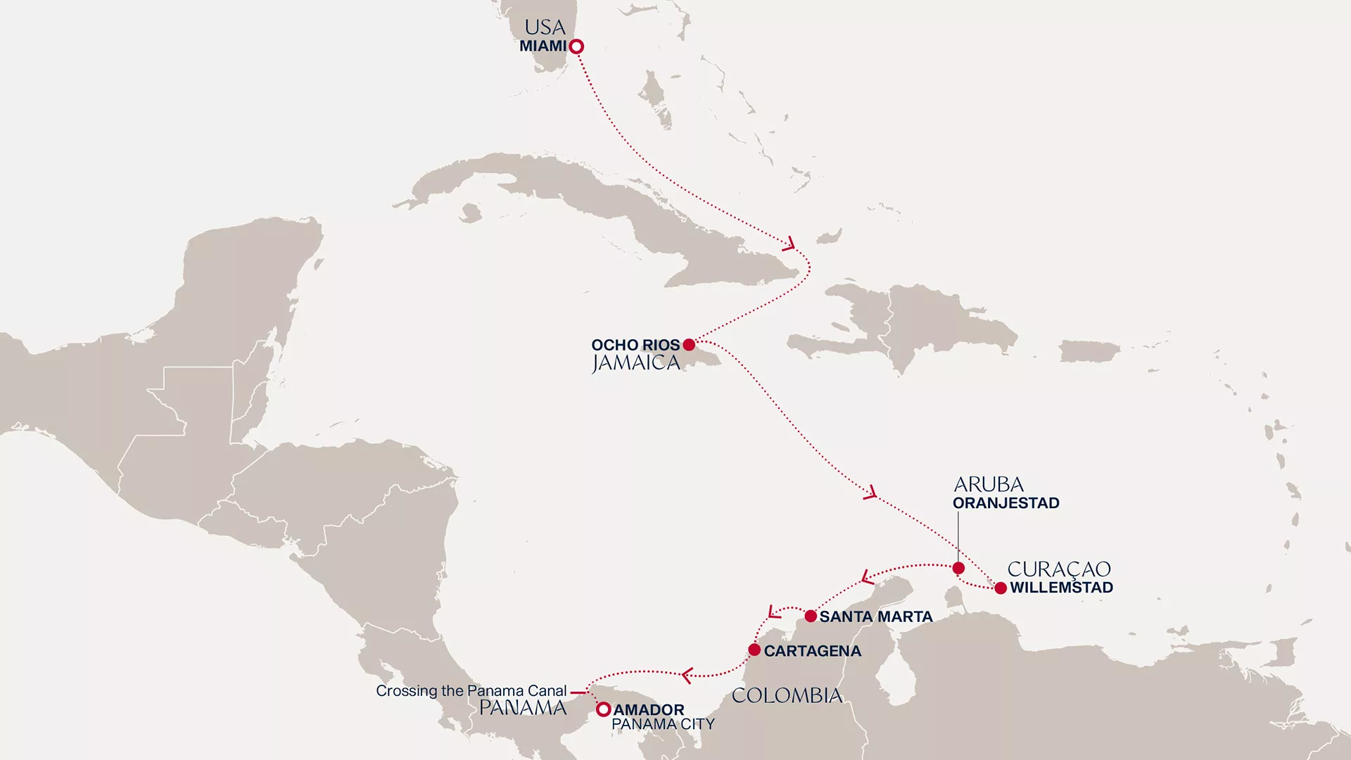 From charismatic Miami, set sail on an extraordinary exploration of natural and modern wonders. Take in the pretty coves of Ocho Rios and bask in Willemstad’s European-Caribbean fusion and glorious beaches. In Oranjestad, absorb the wild beauty of rugged landscapes. Discover Santa Marta’s rich trading history, then overnight in Cartagena, admiring the sunset over ancient city walls. Experience the engineering genius of the Panama Canal, then arrive at Panama City’s dynamic cultural crossroads.