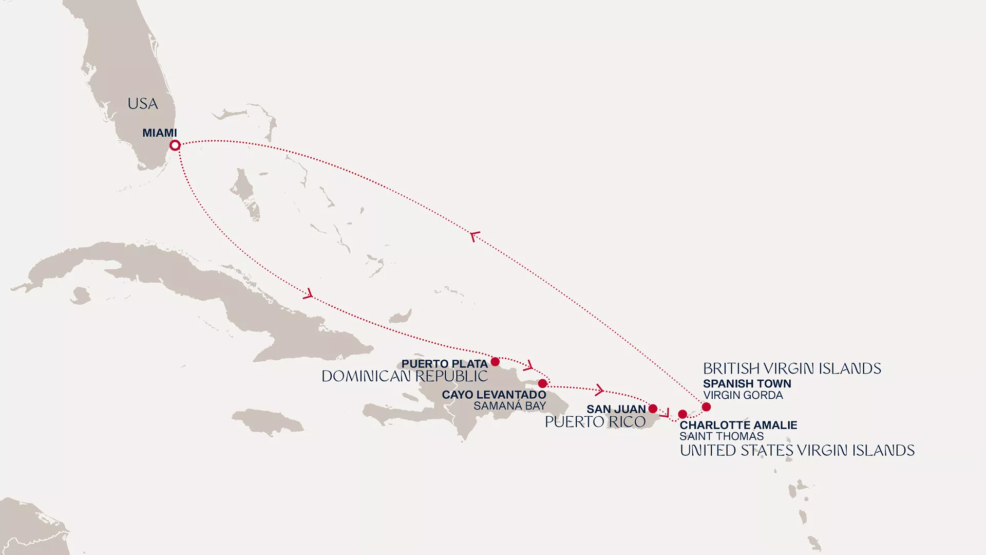 Miami's energy fades into the horizon as you set sail for the Caribbean’s most enchanting shores. In Puerto Plata, history and golden beaches converge, leading to the secluded beauty of Cayo Levantado, a tropical haven of turquoise waters. Wander the cobbled streets of San Juan, steeped in colonial charm, before arriving in Charlotte Amalie, where sunlit harbors invite exploration. Conclude in Virgin Gorda, home to the breathtaking granite formations of The Baths. We return to Miami, carrying the warmth of the Caribbean with us.
