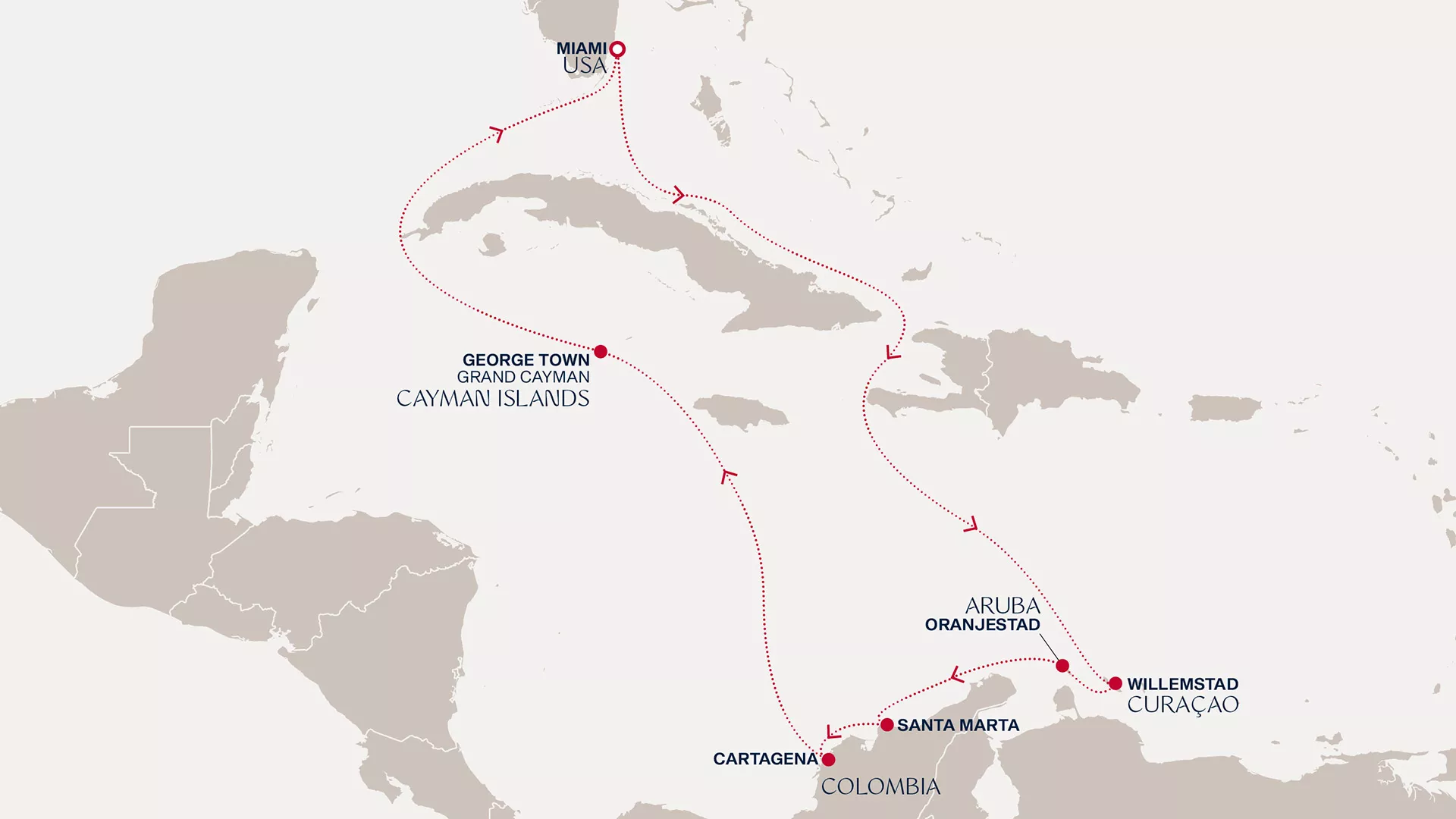 Embark on a sun-soaked Caribbean exploration from Miami, sailing to Willemstad, where vibrant Dutch charm meets Creole cuisine and coral wonders. In Oranjestad, explore colourful streets and pristine beaches, then venture to Santa Marta’s lush mountains and golden sands. Experience the enchantment of Cartagena’s walled city before Grand Cayman invites you to explore spectacular reefs and swim with stingrays. Relax on board as we slowly glide back to Miami’s lively shores.
