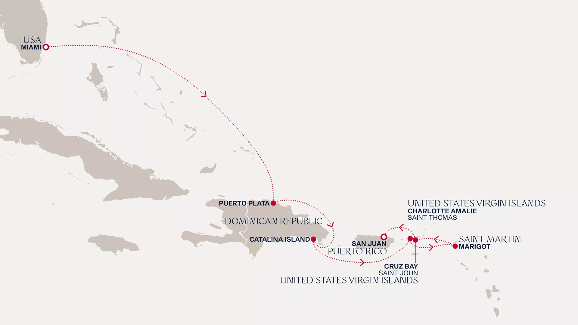 Begin your journey in San Juan and let the salsa rhythms take you to Tortola's lush peaks and vibrant marine life. In Pointe-à-Pitre, discover Guadeloupe's natural wonders and cultural treasures. Gustavia offers you a blend of French elegance and serene beaches, before two restful days at sea let you indulge in ocean-inspired wellness. Our arrival in Ocean Cay promises tranquil Bahamian bliss. Conclude in Miami's Latin flair, ensuring a memorable finale.
