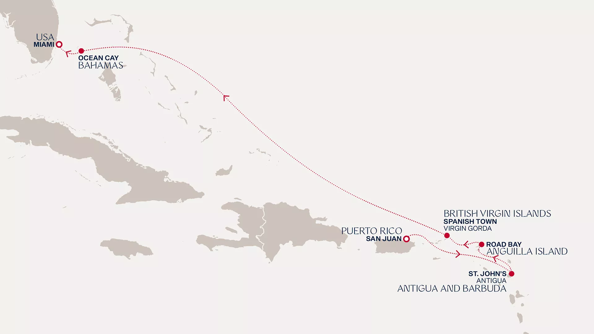 From the bustling streets and ancient forts of San Juan, set sail for adrenaline-fuelled adventure in St. John’s dazzling nature. Explore the secluded corners of Anguilla, then discover the lush scenery and serene beaches of Virgin Gorda. Bask in luxurious serenity on board as we drift to the soothing paradise of Ocean Cay, where pastel-hued buildings and luscious lagoons await. We complete our voyage as iconic South Beach sweeps into view and we salsa, shop, and savour the Miami dream.