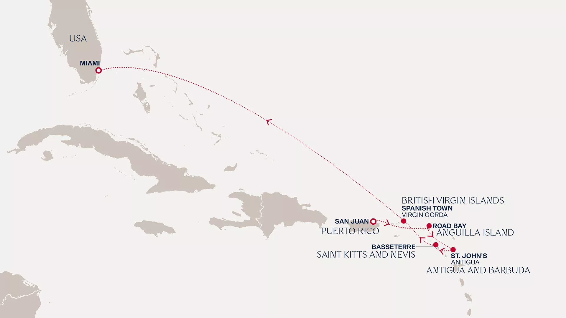 Waltz along secluded shores in pretty Anguilla and spin sugar-cane tales in the pastel-painted port of St. John’s, our gateway to UNESCO naval sites and Shirley Heights hikes. Bounteous Saint Kitts, earthly paradise, lures us with ripe fruits and herb-scented hillsides, before we heed the Virgin Island serenade of Spanish Town and make merry in magnetic Miami.
