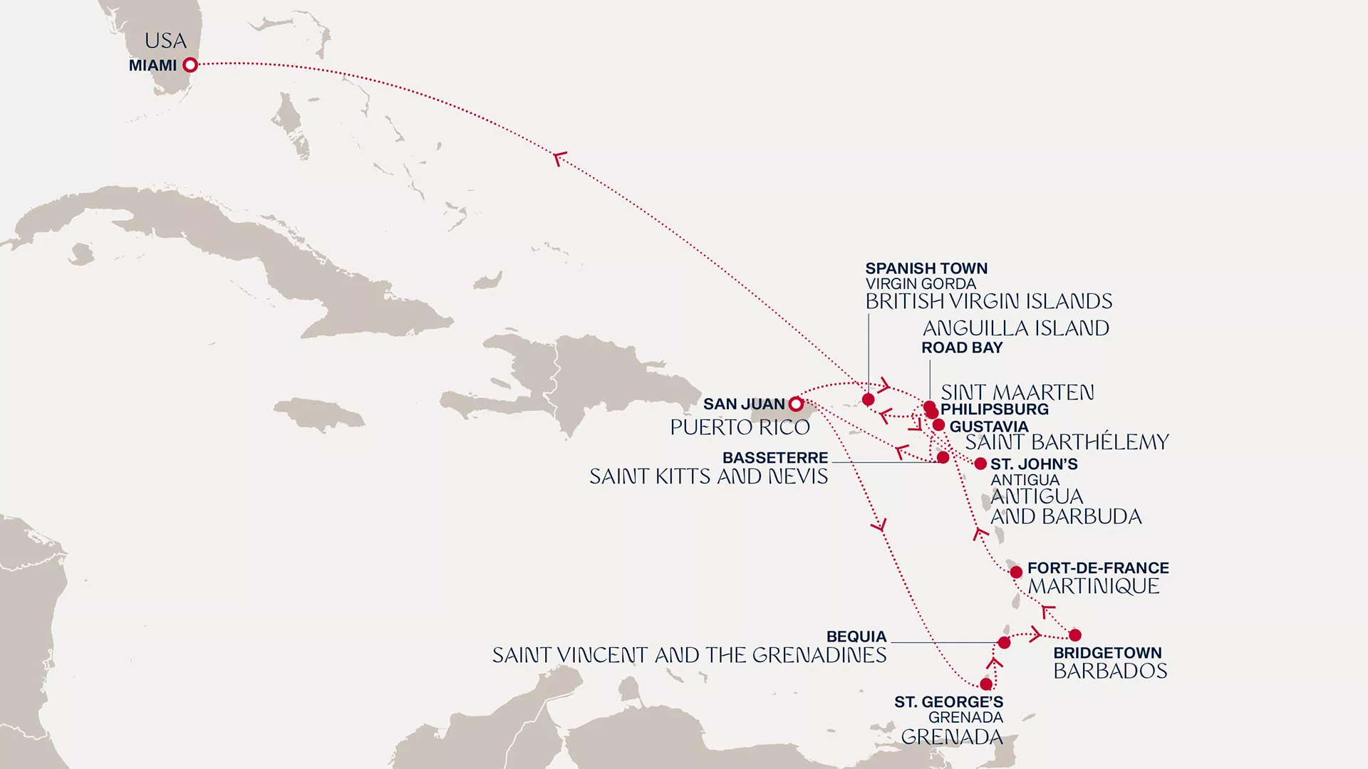 Island adventures beckon as you sail from stylish San Juan to view the submerged sculptures of St George’s and gentle turtles in Bequia. Take time to absorb the culture of Bridgetown, Fort-de-France and Gustavia, then head to the verdant hills of Basseterre. Anguilla’s palm-fringed snow-white sands and underwater wonders lead to St John’s serene nature reserves and the tranquillity of Phillipsburg. Luxuriate aboard EXPLORA II as you drift from Spanish Town’s enchanted pools to Miami's cosmopolitan energy.