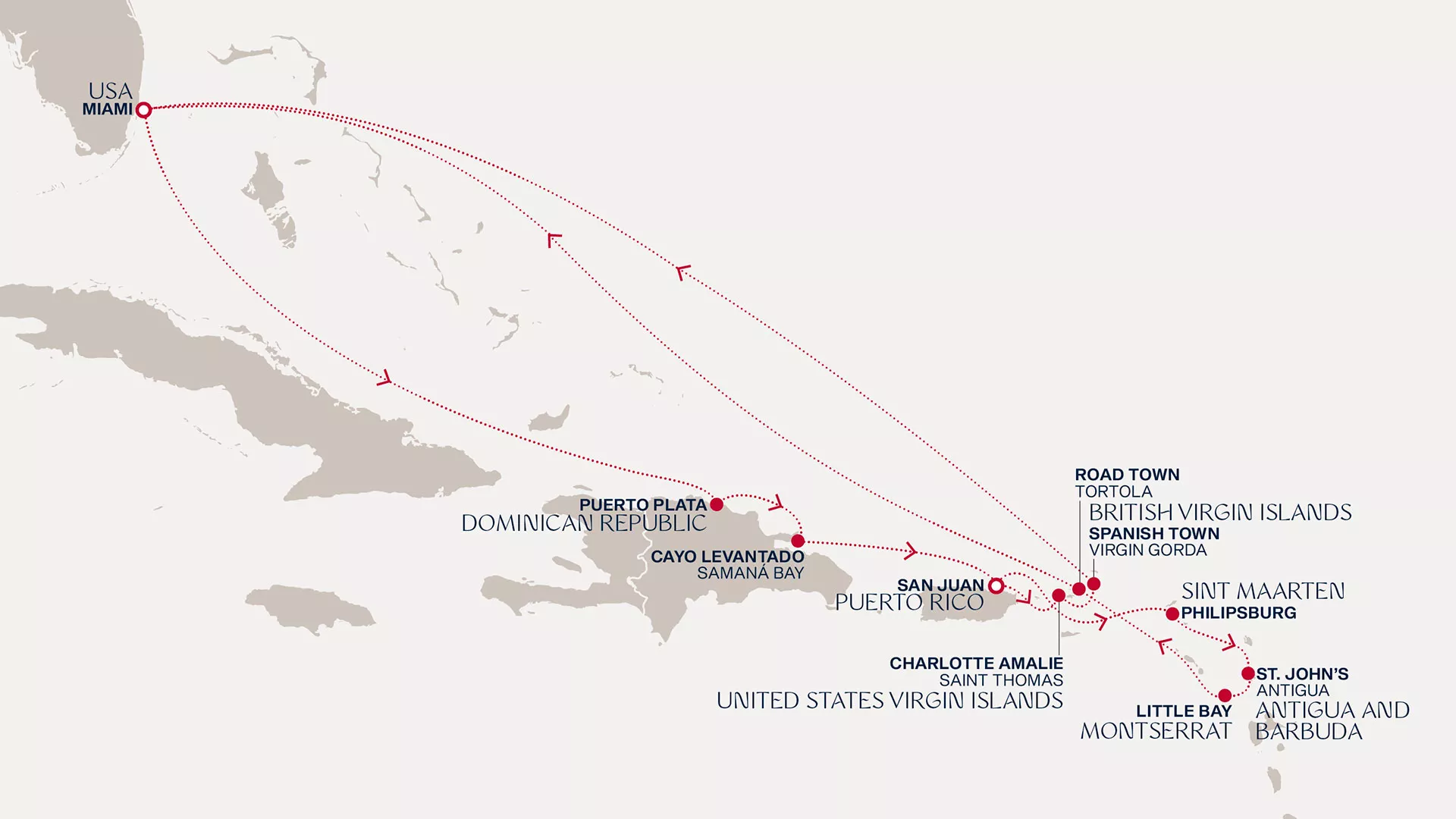 From San Juan’s lively spirit, drift to Philipsburg’s pastel charm and Antigua’s golden beaches. Little Bay offers serenity before Tortola’s rugged beauty, leading you toward Miami’s vibrant shores. Sail on to Puerto Plata’s mountain-backed coast and Cayo Levantado’s tropical calm, then return to San Juan. Charlotte Amalie enchants with Danish heritage, while Virgin Gorda reveals quiet coves and crystalline seas, before your voyage closes with two serene days at sea and Miami’s sunlit embrace.