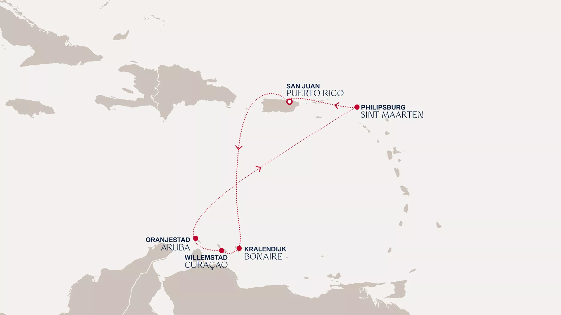 Lively San Juan pulses with vivacious charm as we set sail to the serene shores of Kralendijk, Bonaire. Here colourful reefs and calm beaches combine in a tropical haven. The vibrant architecture of Willemstad enchants, and the Dutch-Caribbean flair continues in Aruba. Unwind on the golden sands by the azure waters of Philipsburg before we return rested and invigorated to the cultural fusions of San Juan.