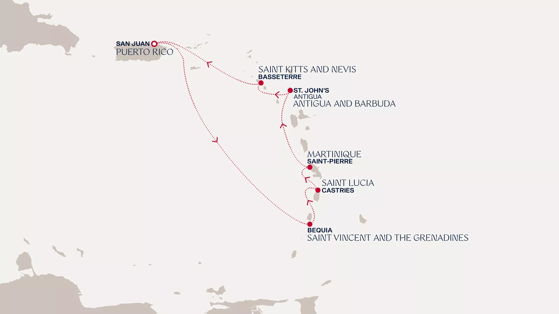 Set sail to the rhythmic beats of San Juan, the oldest US city where the Caribbean's past meets Spanish culture. Then, embrace the tranquillity of Bequia’s secret lagoons and St Lucia’s majestic Pitons. Let the journey take you to the natural beauty of Saint-Pierre and the adrenaline rush of swimming with stingrays in St. John. Leaving Basseterre’s enchanting volcanic landscapes, return to San Juan’s vibrant beaches and rich cultural tapestry.