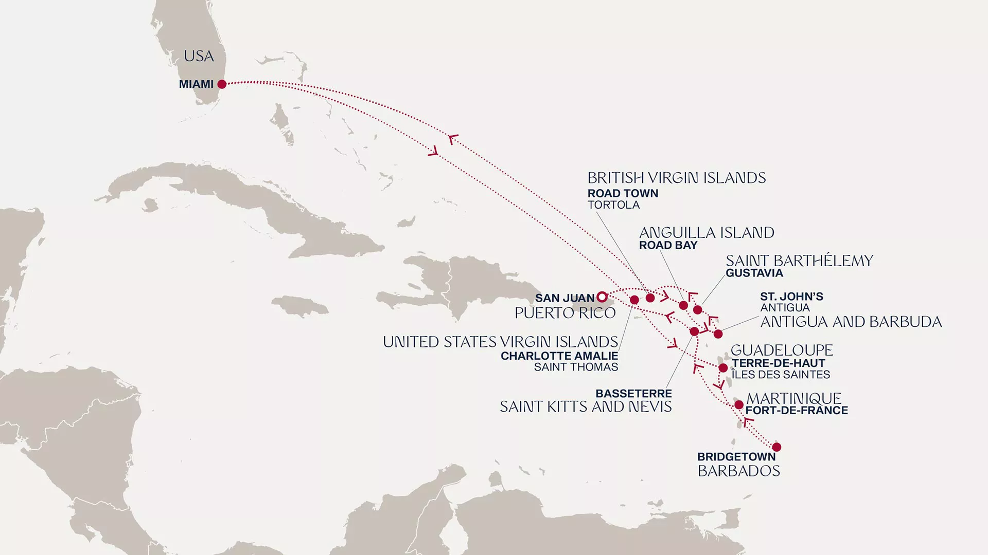 Linger on the sun-drenched shores and idyllic sands of Road Bay, St John's and Gustavia, and soak in Tortola’s lagoons, relishing laid-back island life before vaulting to the bustling beats of lively Miami. Enjoy wellness at sea as you breeze through hues of blue to secluded islands, dipping into crystal-clear waters and embracing peace in Saint Thomas. Discover historic architecture and delicious blends of French-Caribbean flair at Terre-de-Haut, Fort-de-France and Basseterre.