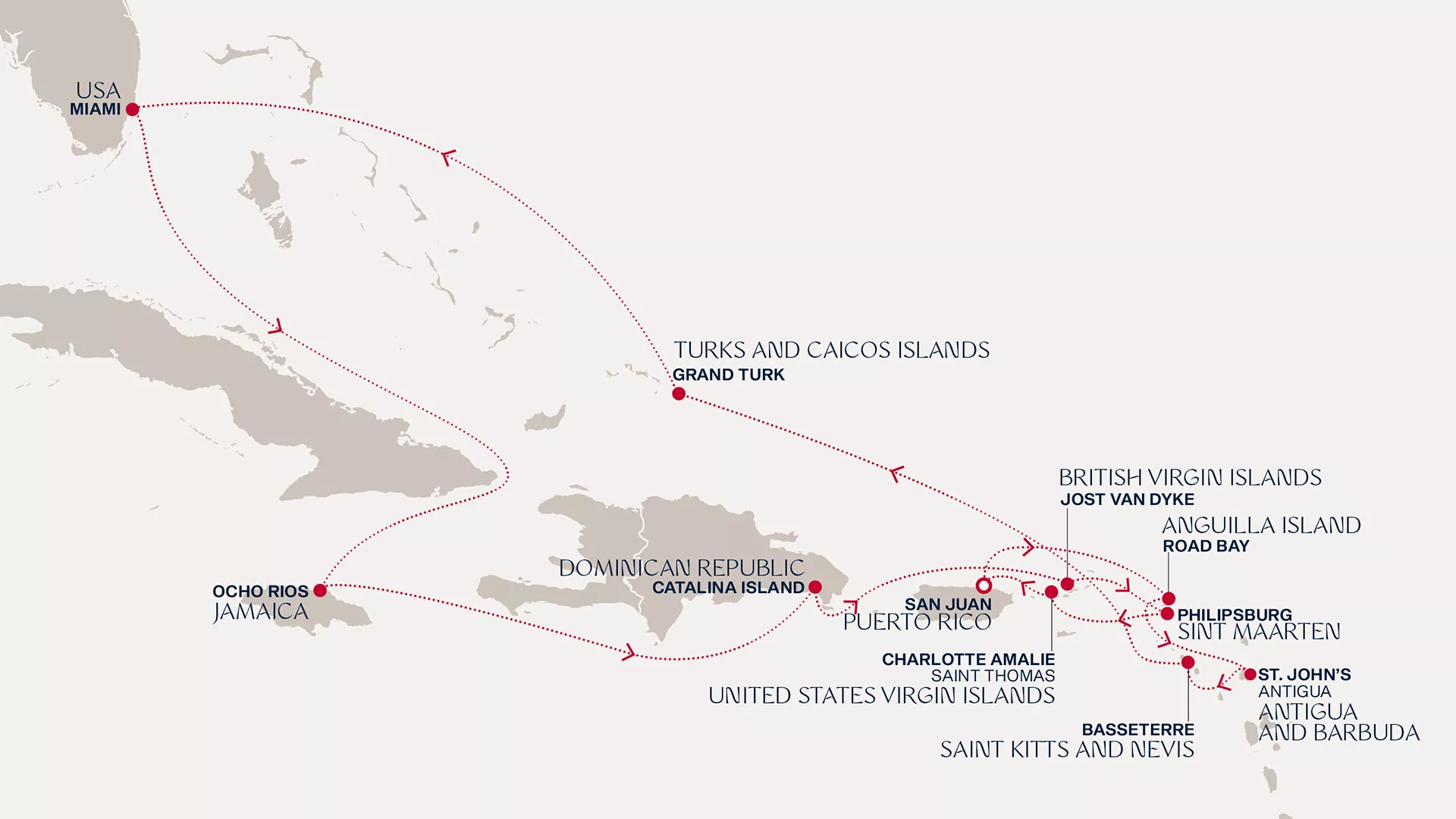 Basseterre, then unwind on Turks and Caicos’ beaches. Return to Miami’s