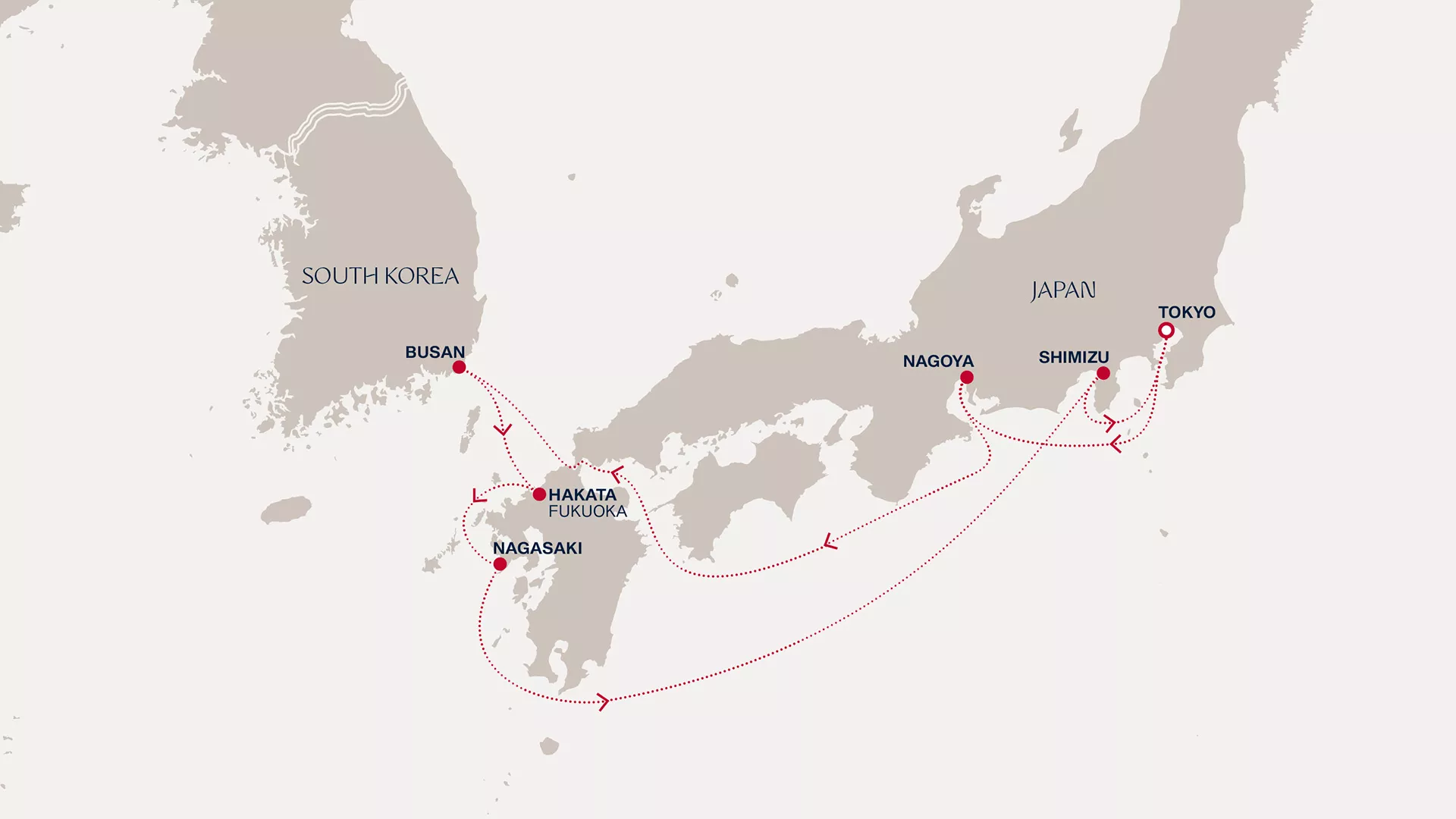 Voyage from Tokyo’s city rhythms to Nagoya, where tradition meets modern elegance in castle grounds and bustling streets. Cross the sea to Busan’s vibrant markets and golden shores, then embrace Hakata’s lively spirit in Fukuoka. In Nagasaki, layered history and tranquil bays invite reflection before sailing on to Shimizu, where Mount Fuji rises over serene waters. Conclude in Tokyo’s dazzling heart, where the journey comes full circle.