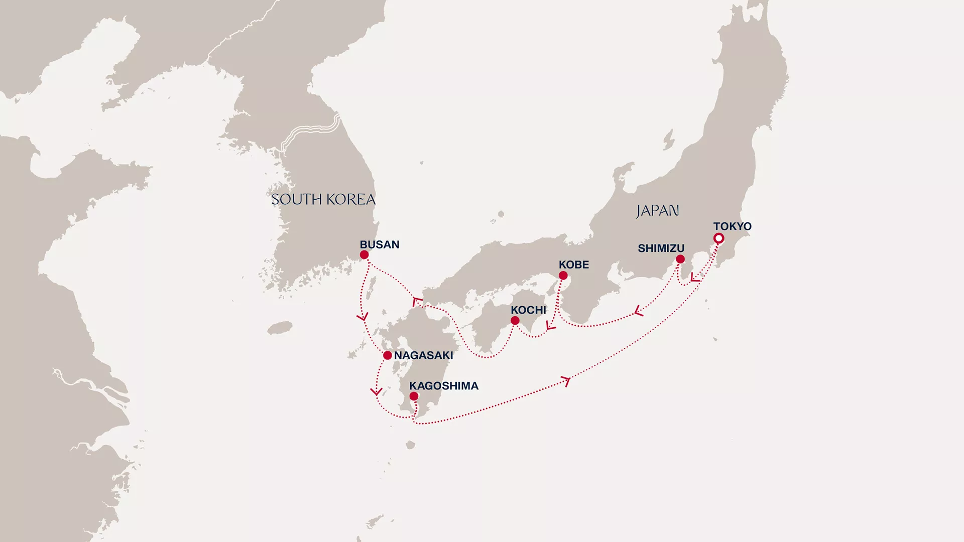 Begin in Tokyo’s vibrant embrace, where tradition and innovation shine side by side. In Shimizu, gaze at Mount Fuji’s snow-capped majesty before gliding to Kobe’s cosmopolitan charm and Kochi’s coastal tranquillity. Cross the sea to Busan’s bustling markets and temples, then step into Nagasaki’s poignant history and Kagoshima’s volcanic landscapes under the gaze of Sakurajima. A final day at sea offers reflection and serenity before returning to Tokyo’s timeless spirit.