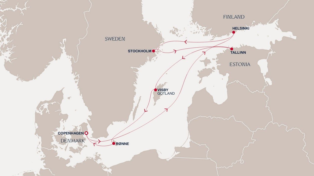 Embrace shimmering seas of serenity and onboard elegance as we cast off from vibrant Copenhagen. We reach Helsinki’s bold blend of urban design and beautiful nature, then enjoy an overnight stay among Stockholm’s grand palaces, fascinating museums and island-dotted horizons. In Tallinn, admire medieval spires that rise above cobbled streets and bustling squares, then sail onwards to Gotland’s windswept shores and Rønne’s artistic allure before returning to the joyous welcome of Copenhagen.