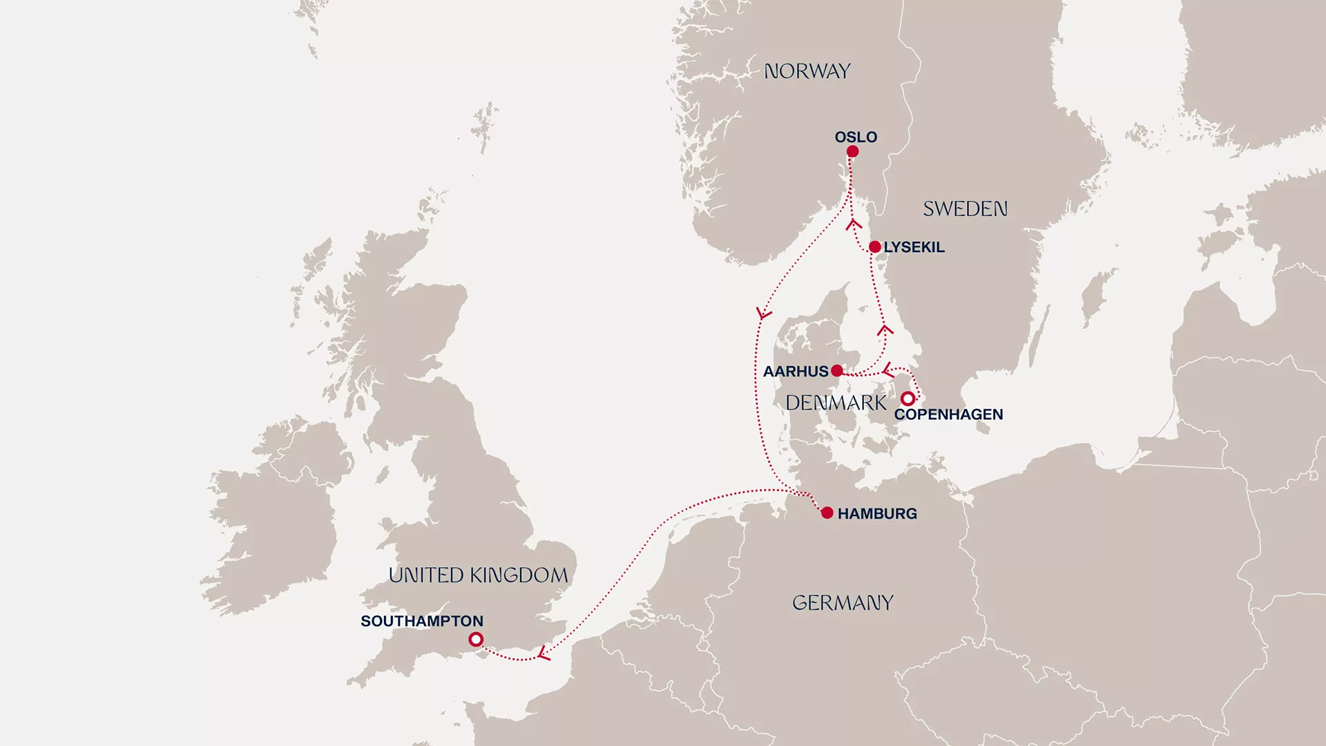 Embark on a captivating journey from lively Copenhagen to the old-town charms and vibrant modern wonders of Aarhus, then onwards along Sweden’s rugged coastline to Lysekil’s granite cliffs and peaceful nature reserves. In Oslo, discover vast green spaces and fjord-centred beauty. Immerse yourself in enriching and relaxing days at sea with a pause to enjoy Hamburg’s dynamic culture and eye-catching architecture before we close this journey in historic Southampton.
