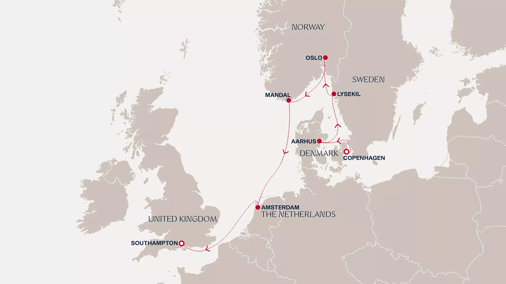 From Copenhagen’s spires, ease to the old-town lanes of Aarhus, then discover Lysekil’s sunlit rocks and fresh sea breezes. Sail onwards to Oslo’s city wonders, emerald parkland and Norse echoes. In Mandal, discover Norway’s southern sands and paradise scenery. Stay overnight in Amsterdam amid glimmering lights over atmospheric canals and golden-age streets, then relax and unwind on a calming day onboard, rejuvenating in the freedom of the ocean air as we reach Southampton’s maritime soul.