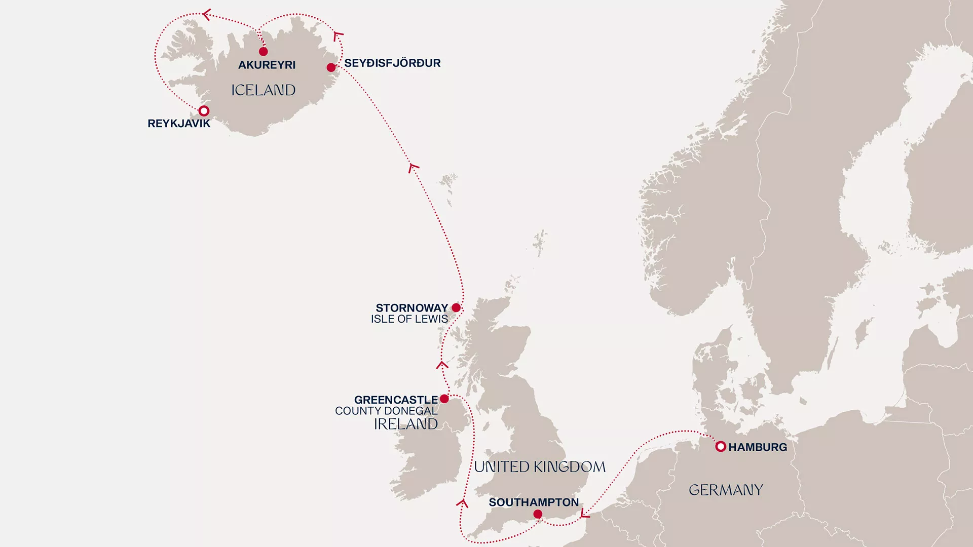 Hamburg, we sail to England’s storied shores in Southampton, then cross to
