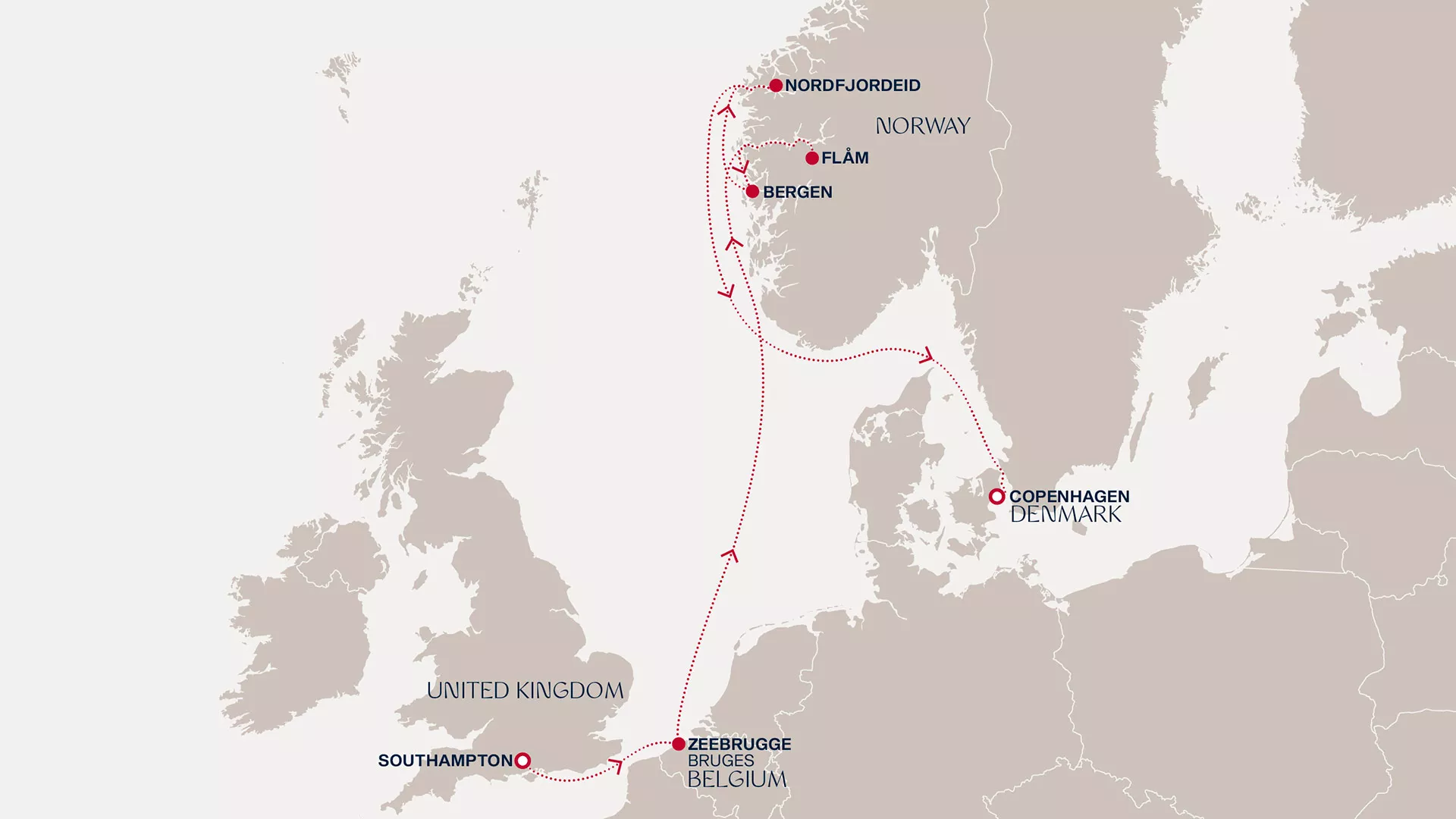 From the maritime soul of Southampton, sail to the cobbled lanes and gabled facades of Bruges, where canals glint beneath medieval towers. Relish a day of calm and wellness at sea before Norway’s beauty rises in Flåm, with crystalline waters and tumbling falls. Stroll among Bergen’s panoramic mountain mists, then discover the majestic peaks, deep lakes and Viking echoes of Nordfjordeid. Another serene pause against a sea-hazed horizon carries you to Copenhagen’s waterside charm.