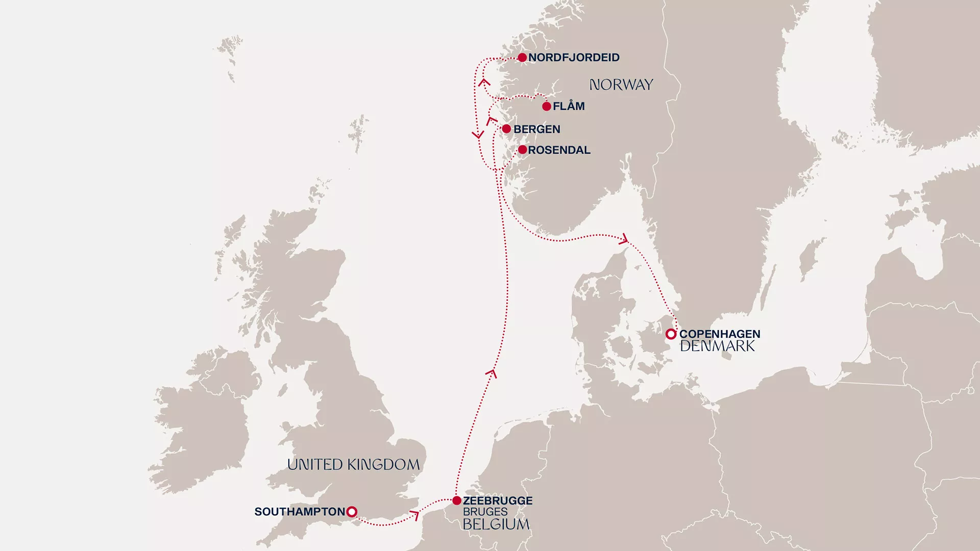 The story of northern waters unfolds along the coast’s lowland harbours and highland peaks. Sail from Southampton to the lace-lined lanes of Bruges and onwards to Bergen’s timber wharves and lush hills, then glide through Flåm’s sheer-sided fjord, where waterfalls tumble like silver threads. In Nordfjordeid, land meets myth beneath towering peaks, while Rosendal welcomes with orchard scents and castle stones. Relax and rejuvenate on open seas to our journey’s finale among the gems of Copenhagen.