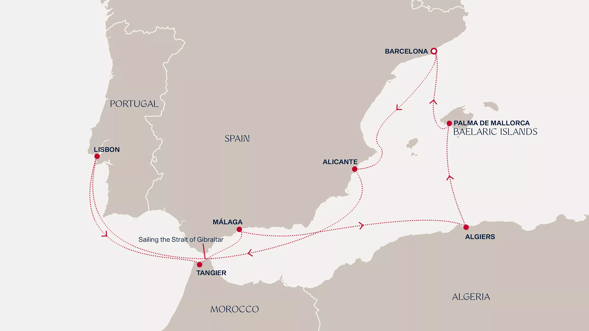 Embrace the rhythms of the shimmering Mediterranean as we drift from Barcelona to the leafy plazas and jagged peaks of Alicante and onwards to overnight in the vibrant charm of Lisbon. Cross to Morocco’s bohemian city of Tangier before exploring Málaga’s Andalusian grace. We slowly drift with the gentle waves to Algiers to experience an intriguing fusion of French and North African flair, then bask on Palma’s spotless beaches and return to rich culture in Barcelona.