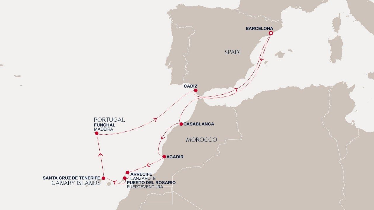 Surrender to the allure of Atlantic horizons and spectacular shorelines. Depart from vibrant Barcelona and sail to the bustling souks of Casablanca and Agadir’s golden coast. Discover the volcanic wonders of Lanzarote and Fuerteventura’s stuning beaches before reaching Tenerife’s dramatic peaks. Funchal’s terraced hillsides offer botanical beauty before Cadiz tempts with flamenco flair and Andalusian rhythms. A return to Barcelona completes your radiant ocean escape.