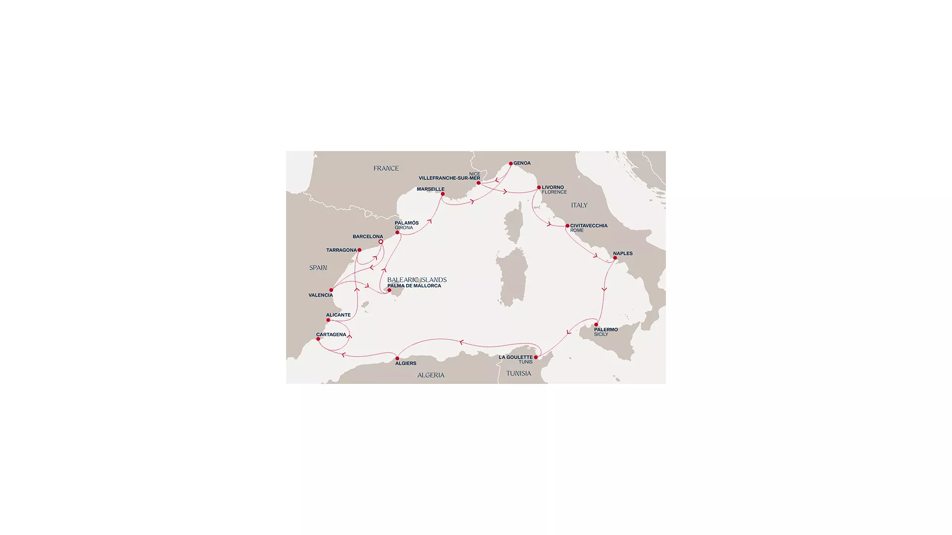 Begin in Barcelona before Valencia, Palma and Palamós set an easy coastal rhythm. Crossing to France and Italy, Marseille and Genoa reveal working harbours and layered histories, while the Riviera and Florence bring refinement and artistic depth. From Rome, the journey continues south to Naples and Palermo, then to Tunis and Algiers, where North African culture adds a distinct perspective. Returning to Spain, Cartagena, Alicante and Tarragona unfold along the coast, before concluding back in Barcelona after a richly varied passage.