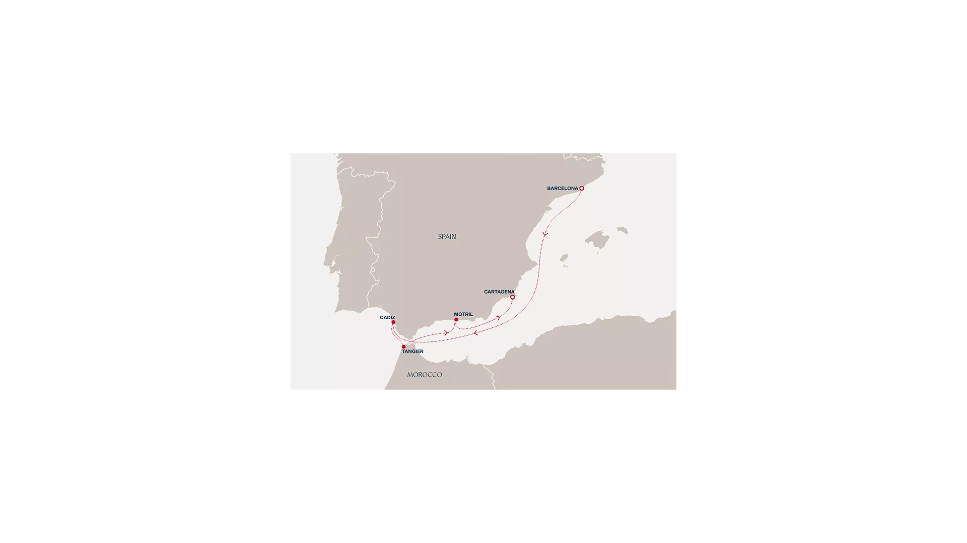 From Catalonia’s creative heart, glide into a leisurely rhythm of wellness and reflection at sea, then sail into Cádiz, steeped in sherry traditions, flamenco spirit and layered histories. Cross to Tangier’s bohemian energy and colourful street life, and onwards to the lush landscapes and splendour of the Costa Tropical in Motril before our final stop among the culture and heritage of Cartagena.