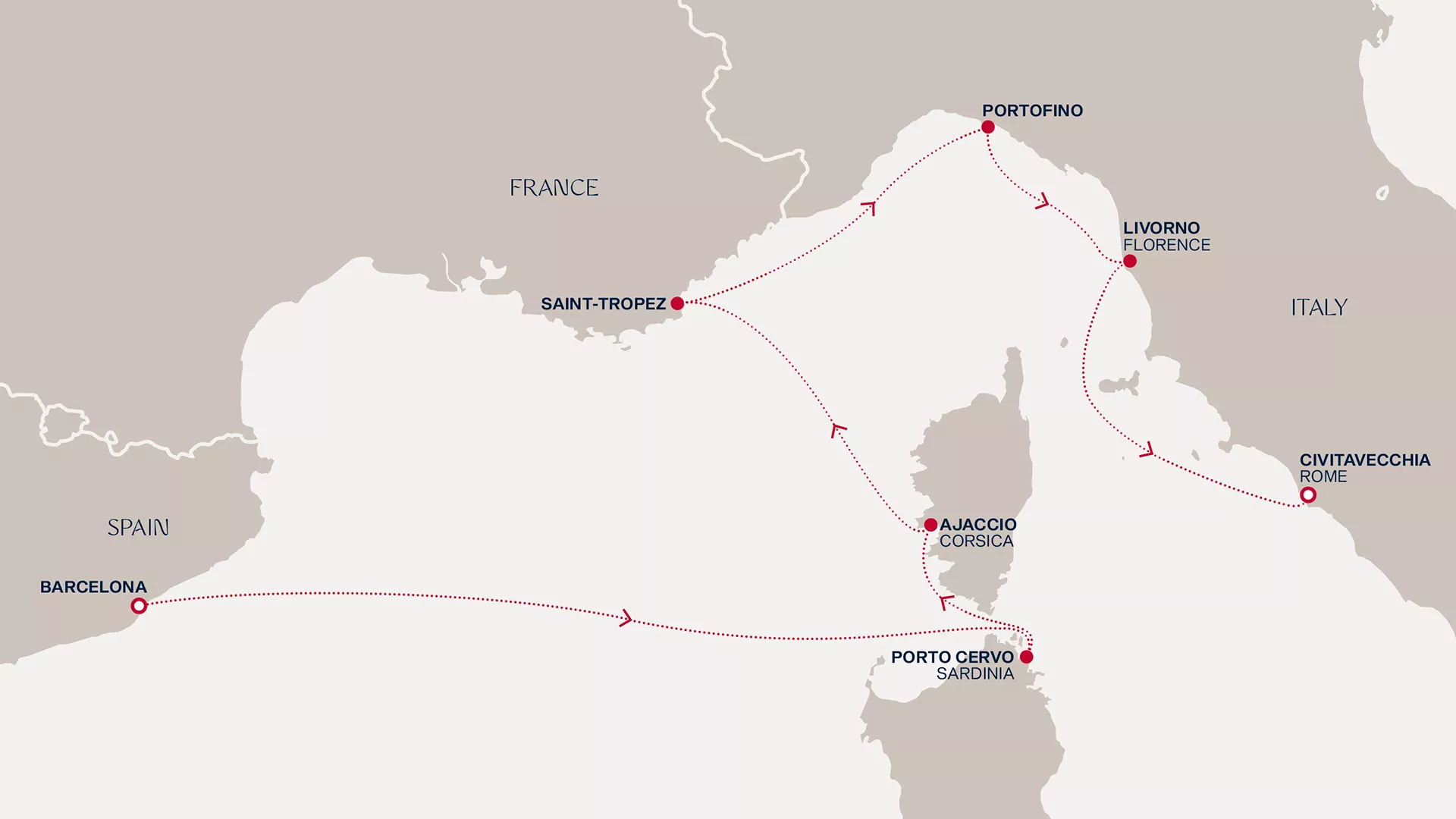 Breathe in Barcelona’s cultural heart before tracing the contours of Porto Cervo on Sardinia’s stunning Costa Smeralda, a sunlit paradise of turquoise coves. Drift into Ajaccio, birthplace of Napoleon, where Corsican charm meets stunning island landscapes. Stroll through Saint-Tropez to experience Riviera glamour, and marvel at Portofino’s jewel-like harbour. Immerse yourself in Florence’s Renaissance wonders, then glide to Rome, where ancient marvels await.