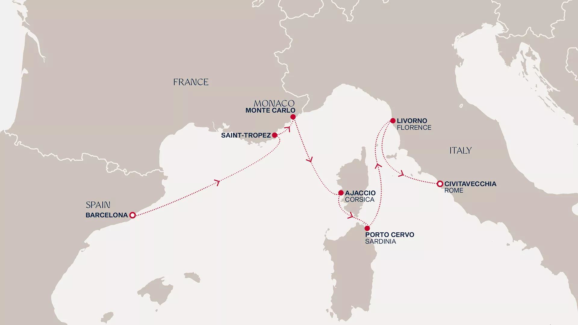 Sun rises over buzzing Barcelona as we retrace Grace Kelly’s Mediterranean honeymoon and soak up sun-drenched yachty glamour, glittering Monte Carlo mingling old-world Belle Epoque with contemporary Cote d’Azur chic. We island hop amid craggy beach beauty from the Corsican capital and Bonaparte’s birthplace to fine white sands on Sardinia’s jet-set Costa Smeralda until sights fix on jewels from classical antiquity and the Italian Renaissance.