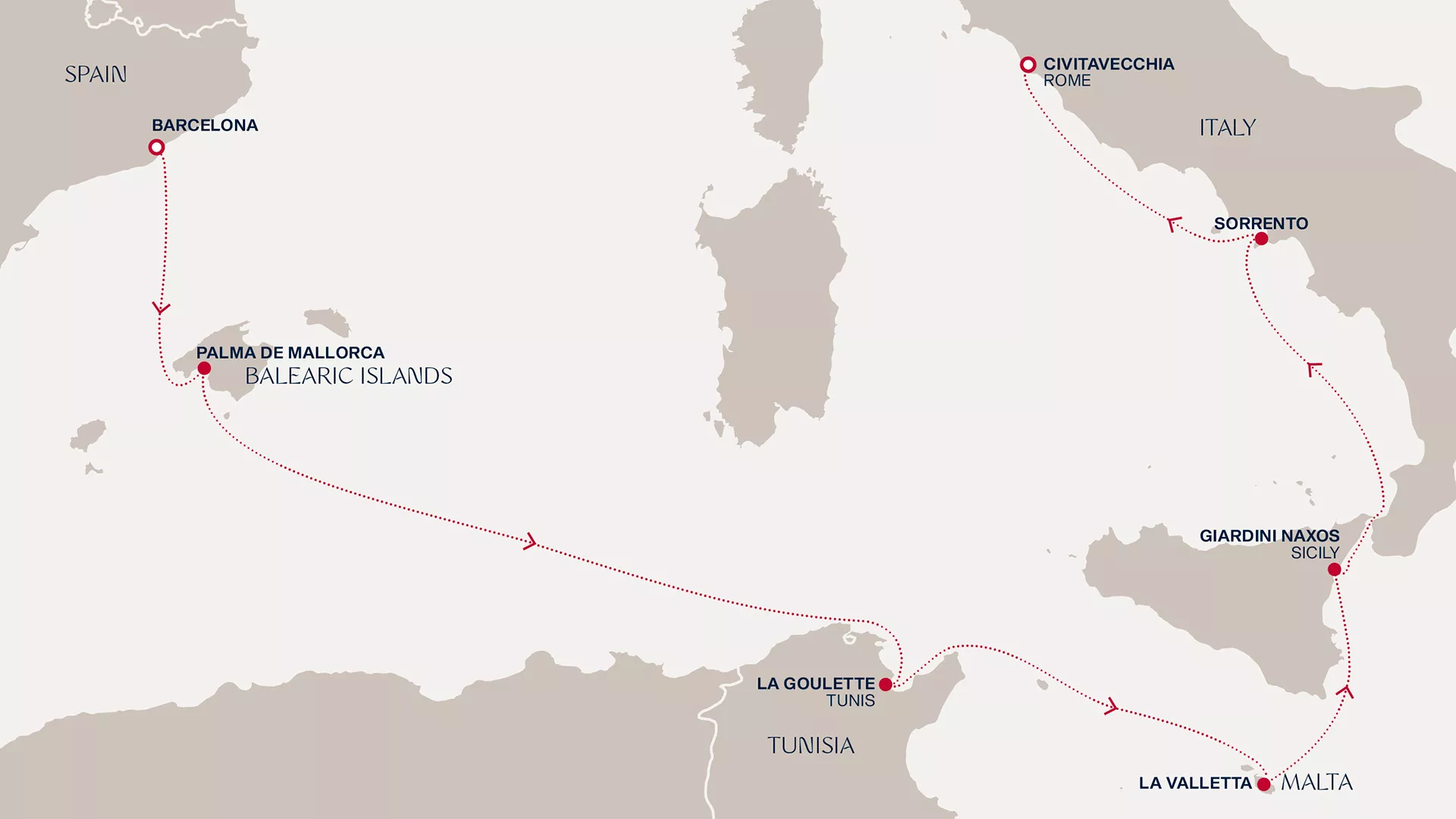 Begin in Barcelona’s artistic embrace before Palma de Mallorca’s golden shores invite relaxation. A tranquil day at sea leads to La Goulette’s gateway to Tunisian heritage and the ancient wonders of Carthage. Discover Valletta’s honey-hued fortifications, then Sicily’s dramatic beauty from Giardini Naxos. Sorrento enchants with cliffside vistas and lemon-scented breezes, before arriving in Civitavecchia, gateway to Rome’s timeless treasures — a voyage rich in culture, coastline, and captivating history.