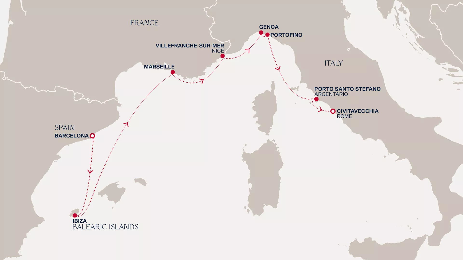 Free-spirited Balearic summer nights slip into French chic as we saunter the Cote d’Azur. Genoa surprises with its Renzo Piano-designed port, medieval old town and 100 palazzi, before Portofino’s inimitable elegance, pastel-coloured houses, sun-warmed waters and superb restaurants. Lean into la dolce vita as we weave Tuscany’s islands amid pristine blues to its stylish hideaway on Monte Argentario, arriving at the Eternal City at sunrise.