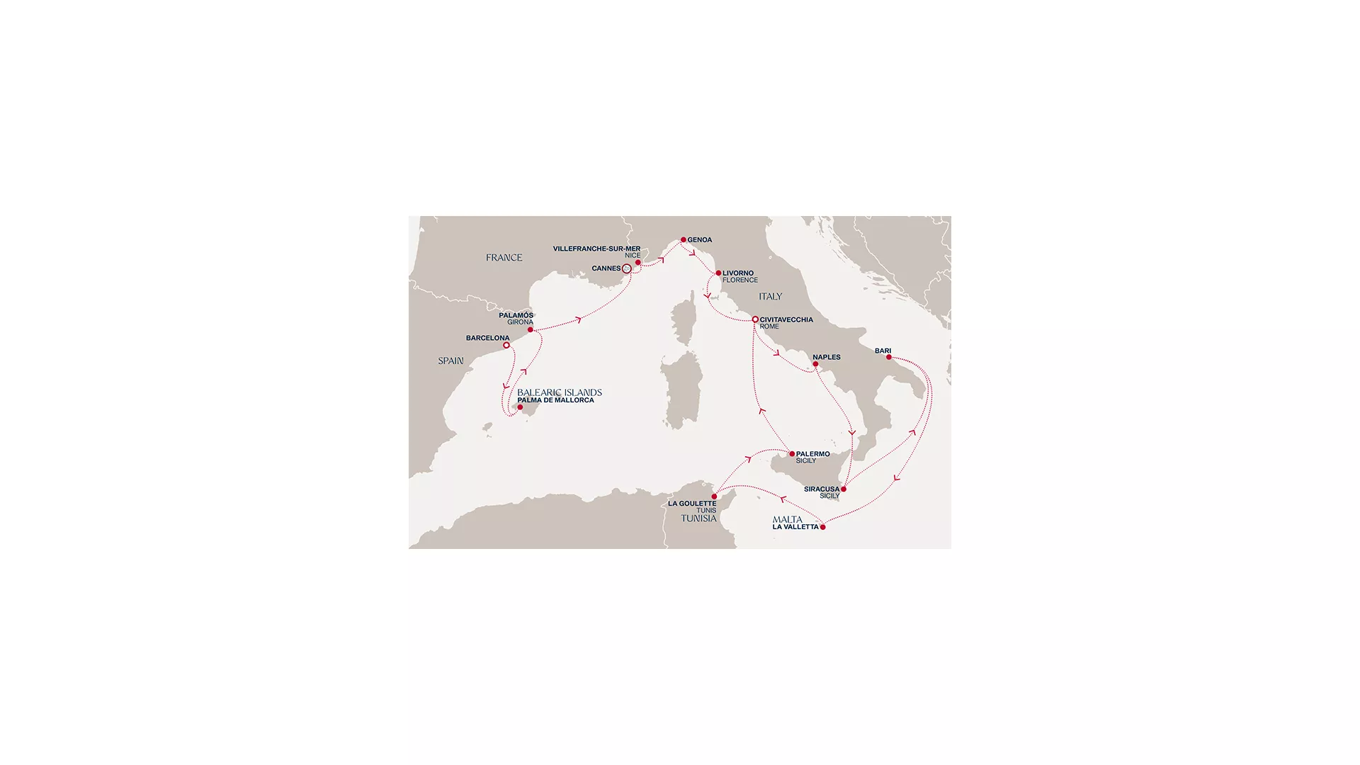Begin in Barcelona before Palma and Palamós introduce a relaxed coastal rhythm. In Cannes, welcome the New Year with a spectacular celebration on the Riviera, followed by the elegance of Nice and Genoa’s maritime character. Florence and Rome bring cultural depth, then the journey turns south to Naples and Siracusa’s layered histories. Bari offers a different pace before crossing to Valletta and Tunis. Palermo closes the loop with vibrant Sicilian life, before returning to Rome, enriched by a journey of contrast and celebration.