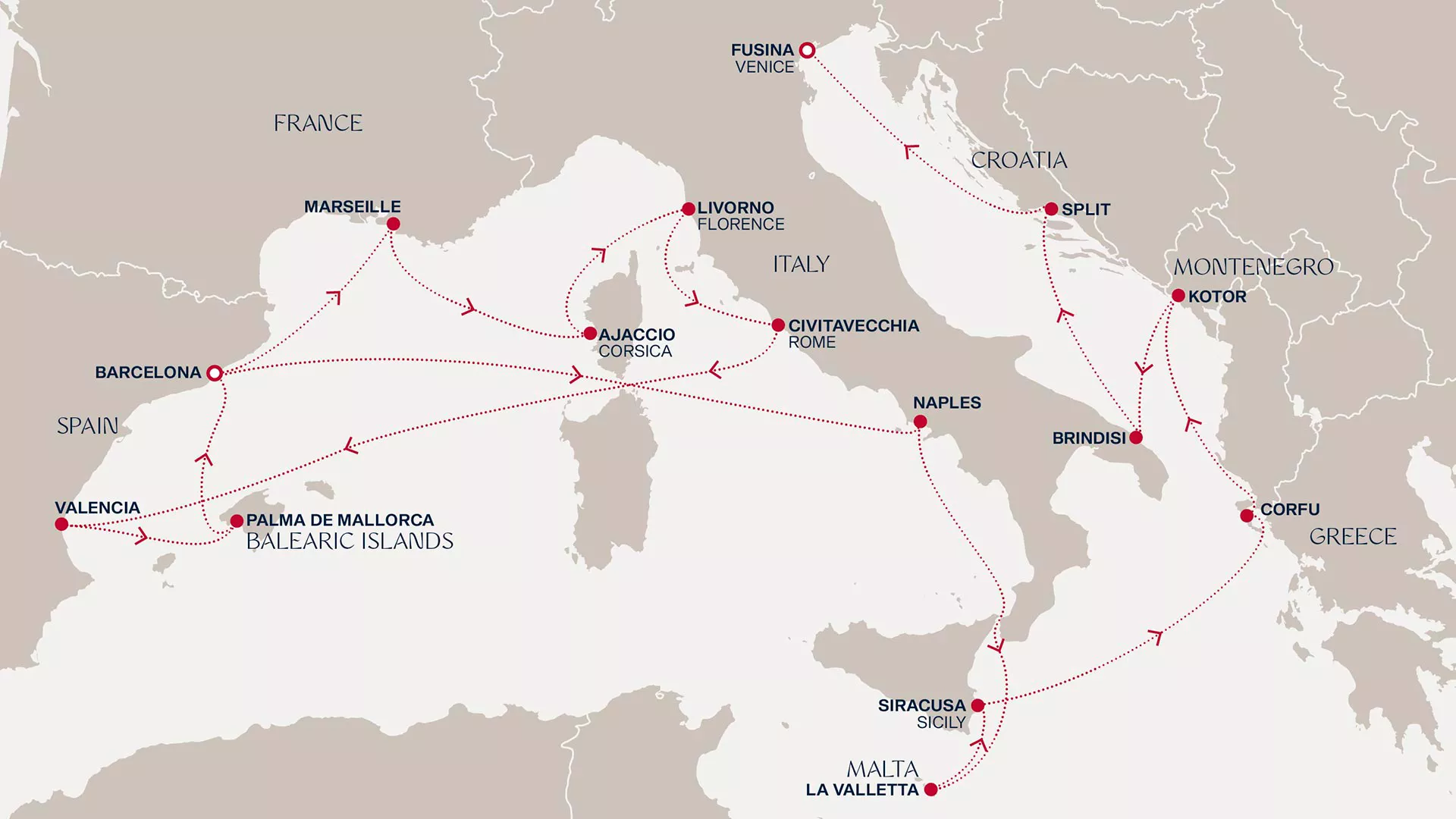 Corfu’s calm, Kotor’s magic, Brindisi’s Puglian allure and Split’s paradise shores. In Venice, canals and