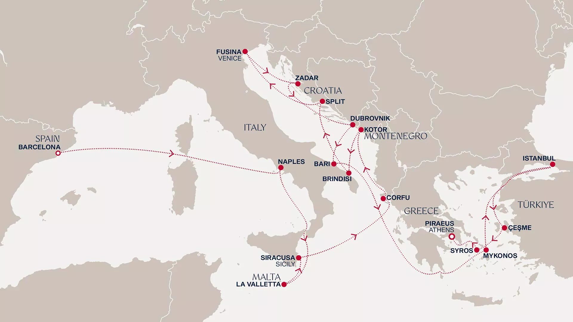 Venice’s canal-side elegance, then onwards as the striking sights of Zadar and Dubrovnik unfold. Explore charming Bari and lively Mykonos before pausing for a magical overnight stay in vibrant Istanbul. Continue to Çeşme’s sunny shores and Syros’s neoclassical grace before