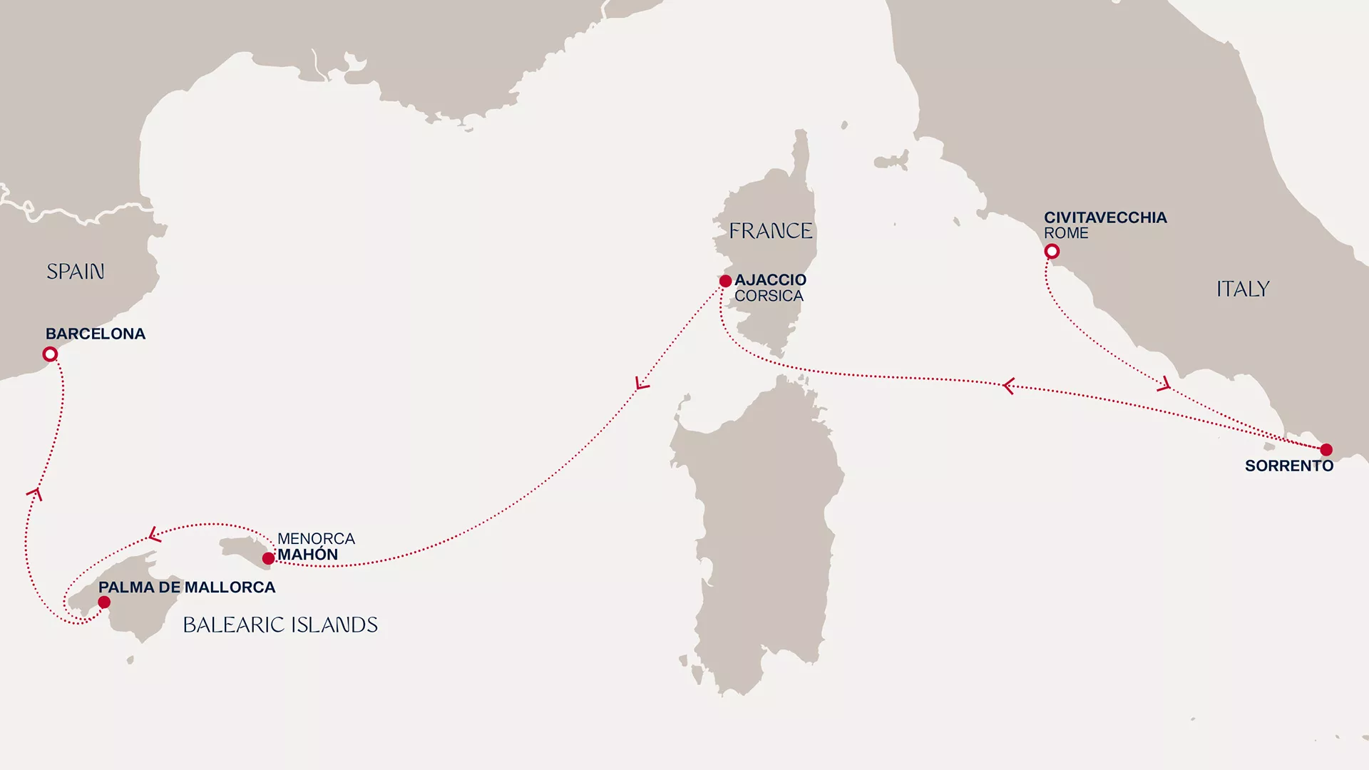 Sail from Rome’s timeless grandeur to Sorrento, where history and flavour spill onto vibrant streets. Slow the pace in your peaceful Ocean sanctuary on board, before gliding onward to Ajaccio’s Corsican charm. The Balearics beckon with Menorca’s tranquil Mahón harbour and Palma de Mallorca’s golden Gothic splendour. Conclude in Barcelona, where bold creativity and Mediterranean energy bring this radiant journey to a close.
