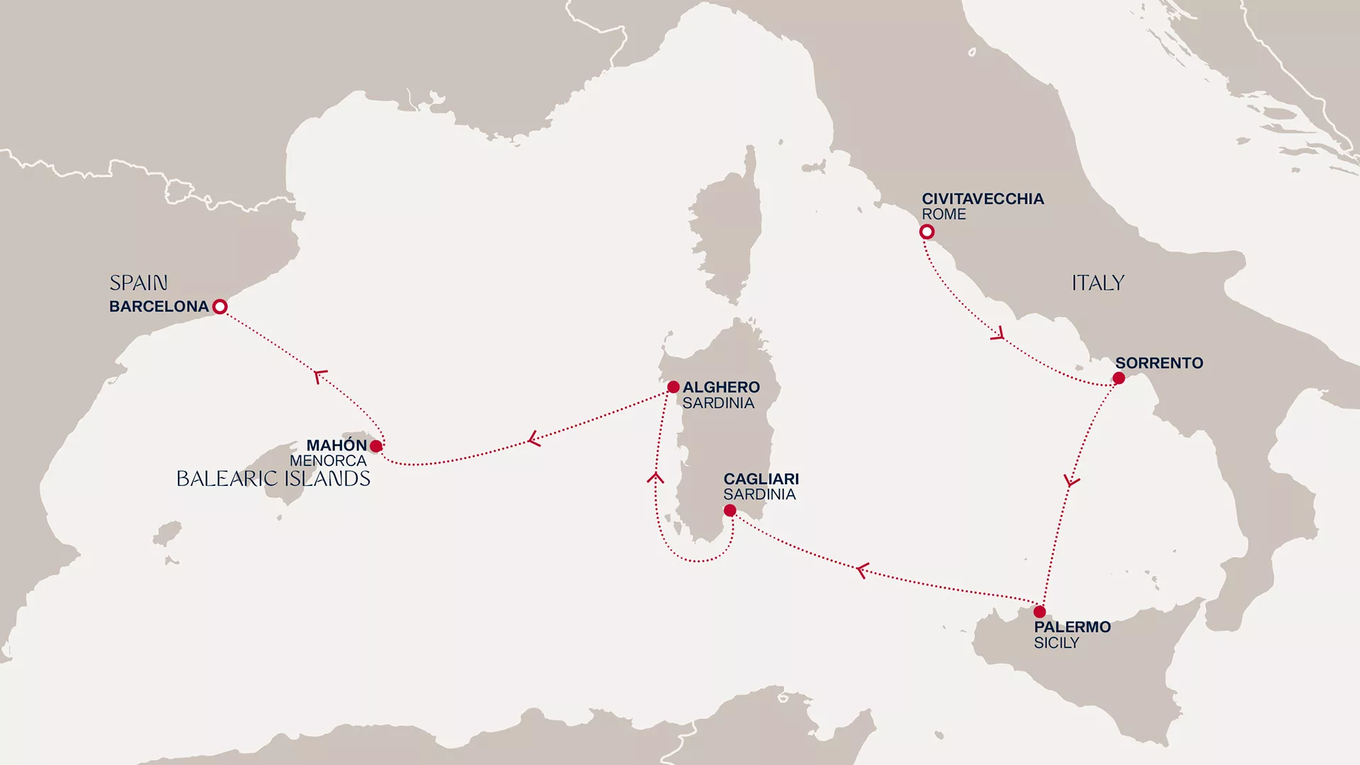 Between the Pantheon’s quiet beauty and ghostly Pompeii, the power and seduction of Ancient Rome slips into our senses. From Sorrento we Med-island hop to Sicily’s Palermo, all faded glamour, fine churches, culinary riches and catacombs, and Sardinia, land of giants and stone fortresses with stunning wild shores and epic stretches of fine white sand. We close with Spanish charm in the Balearics and Barcelona.