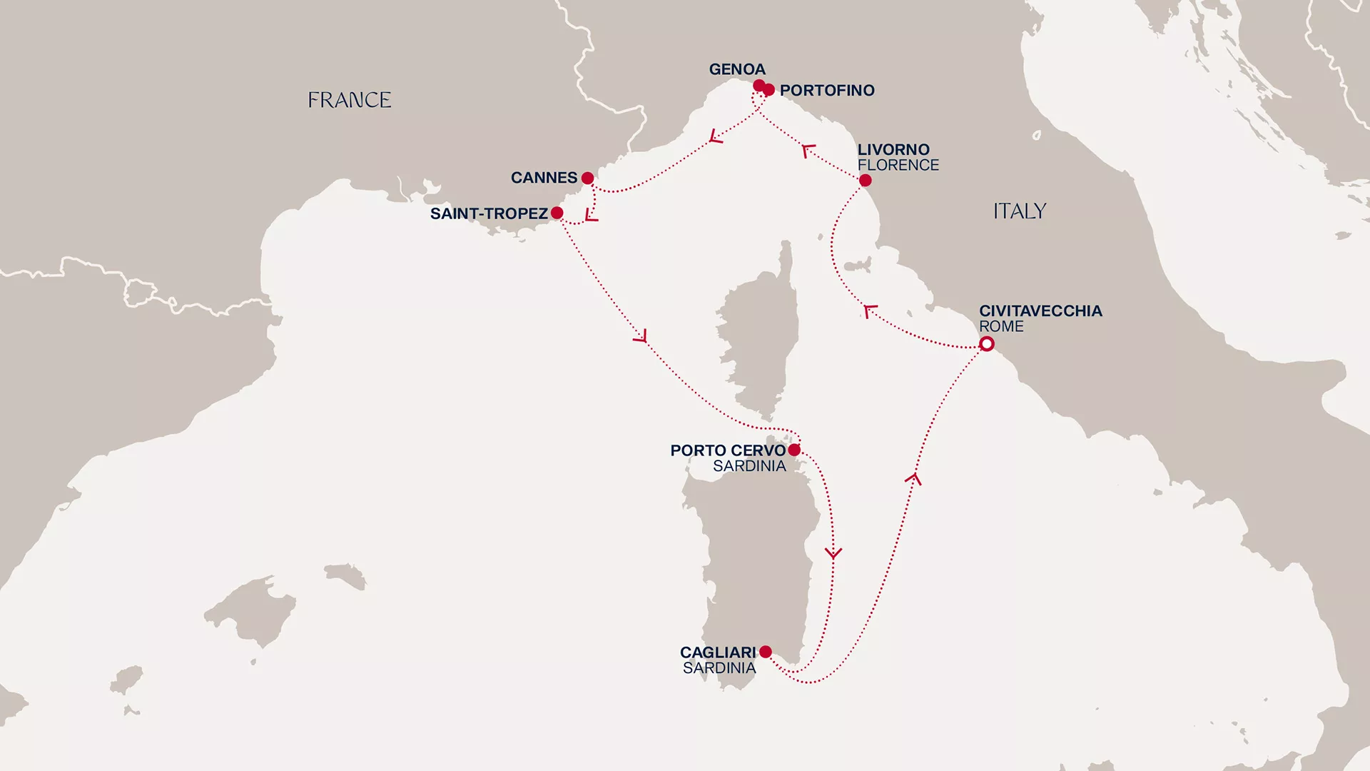 Begin in Rome, where ancient grandeur and vibrant street life set the tone, before Florence unveils its Renaissance masterpieces. Genoa’s proud maritime heritage and Portofino’s polished glamour unfold along the Italian Riviera, followed by the elegance of Cannes and Saint-Tropez on the Côte d’Azur. In Sardinia, Porto Cervo sparkles with emerald waters and Cagliari reveals historic charm. A restorative day at sea completes this stylish Mediterranean escape, before returning to timeless Rome.