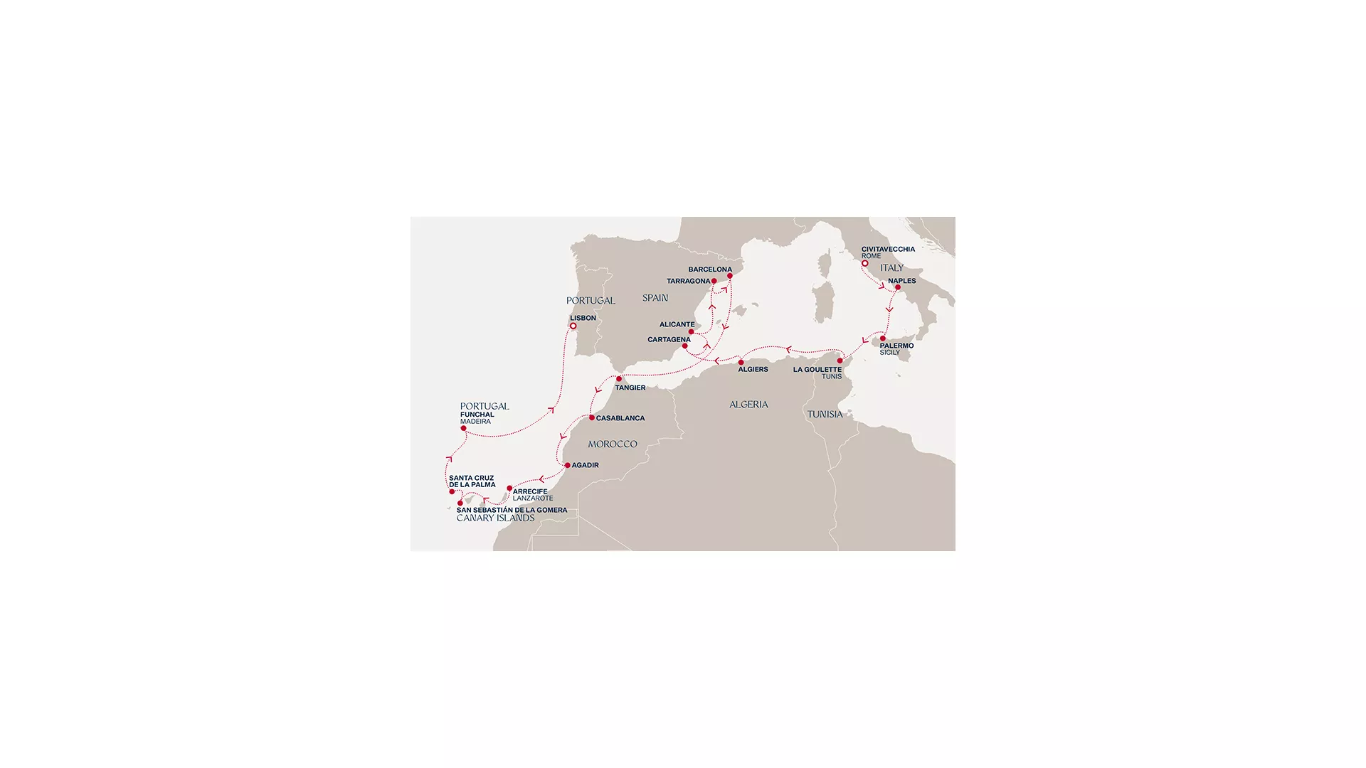 Begin in Rome before Naples and Palermo introduce southern Italy’s layered character, followed by Tunis and Algiers, where North African culture reshapes the journey’s perspective. Returning briefly to Spain, Cartagena and Barcelona offer a familiar rhythm before turning south once more to Tangier and Casablanca. The route then opens into the Atlantic, where volcanic landscapes and quieter island life unfold across the Canaries and Madeira. Concluding in Lisbon, the journey traces a gradual shift from enclosed seas to open ocean horizons.