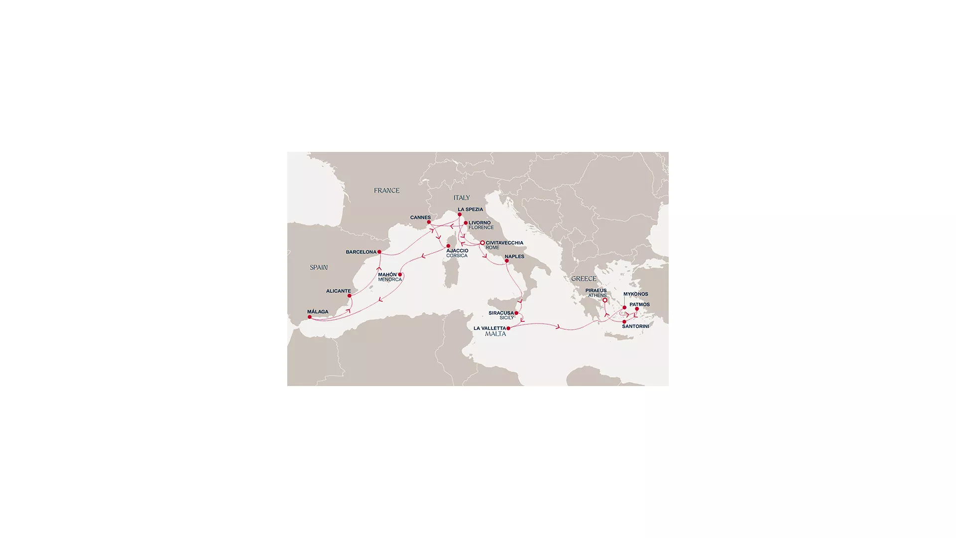 Begin in Rome before Florence and Cannes introduce art and Riviera elegance. Corsica and Menorca offer a quieter island perspective, followed by Málaga’s lively coastal culture and Alicante’s relaxed pace. After Barcelona, the journey turns east to La Spezia and Rome once more, then continues through Naples, Sicily and Valletta, where history unfolds in layered forms. Crossing into the Aegean, Mykonos, Patmos and Santorini each reveal distinct identities, before arriving in Athens, where the voyage concludes with a sense of continuity and change.