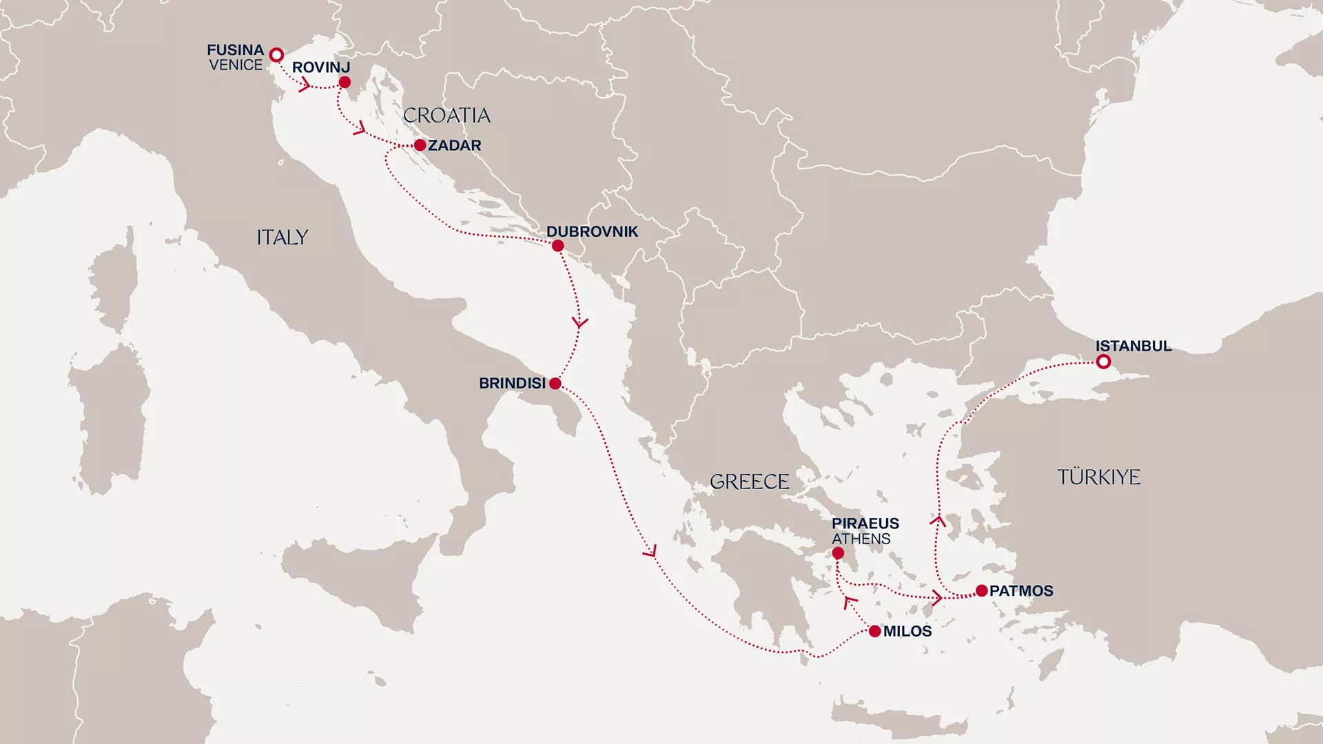 Slip away from Venice’s quiet waterways to the pastel lanes of Rovinj and Zadar’s Roman traces and sea-borne rhythms. Dubrovnik’s limestone beauty leads to Brindisi’s twin harbours and palm-lined promenades, before a relaxing pause at sea opens the horizon. Volcanic Milos unfolds in mineral hues, Athens embraces modern life beneath classical silhouettes, then Patmos invites reflection among sacred heights. Istanbul closes the arc with layered neighbourhoods in a city that never stands still.